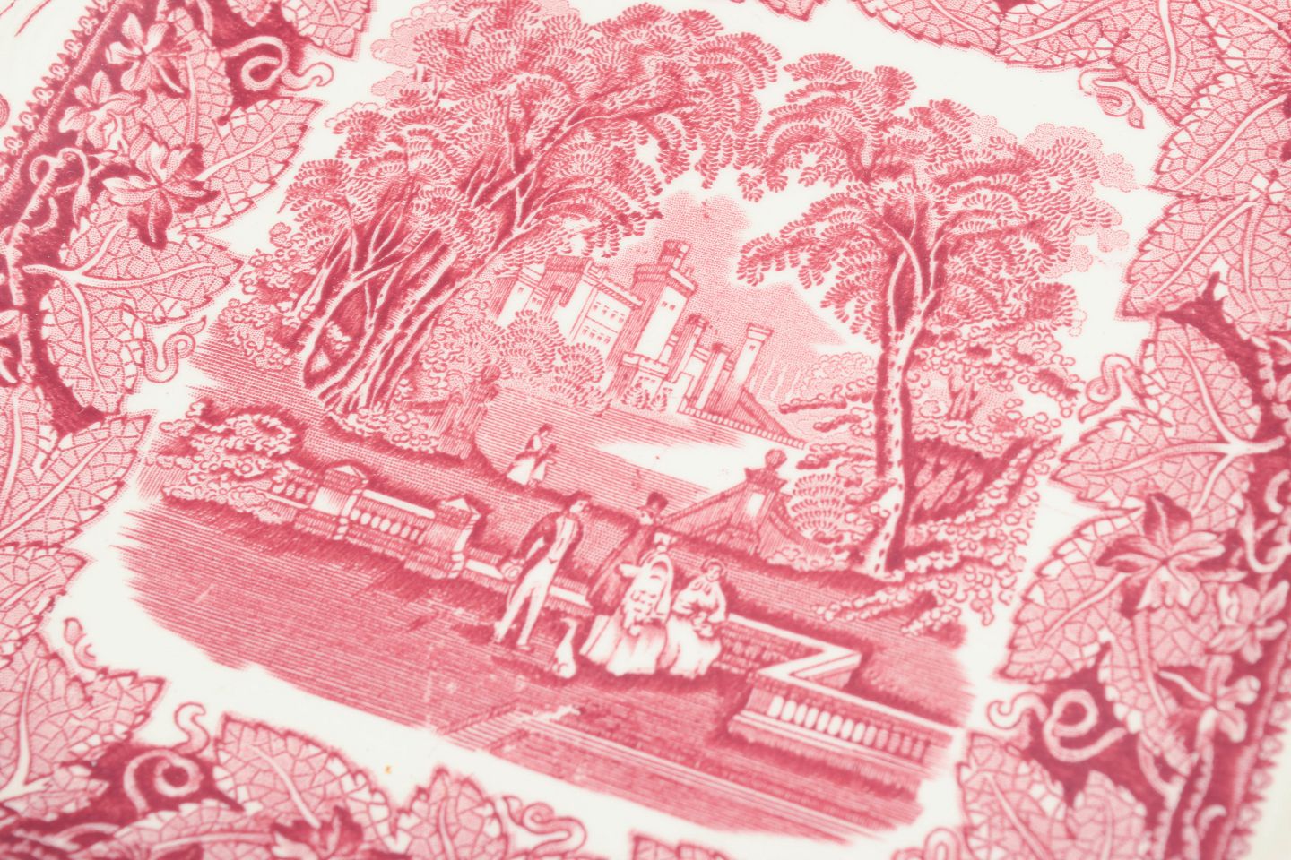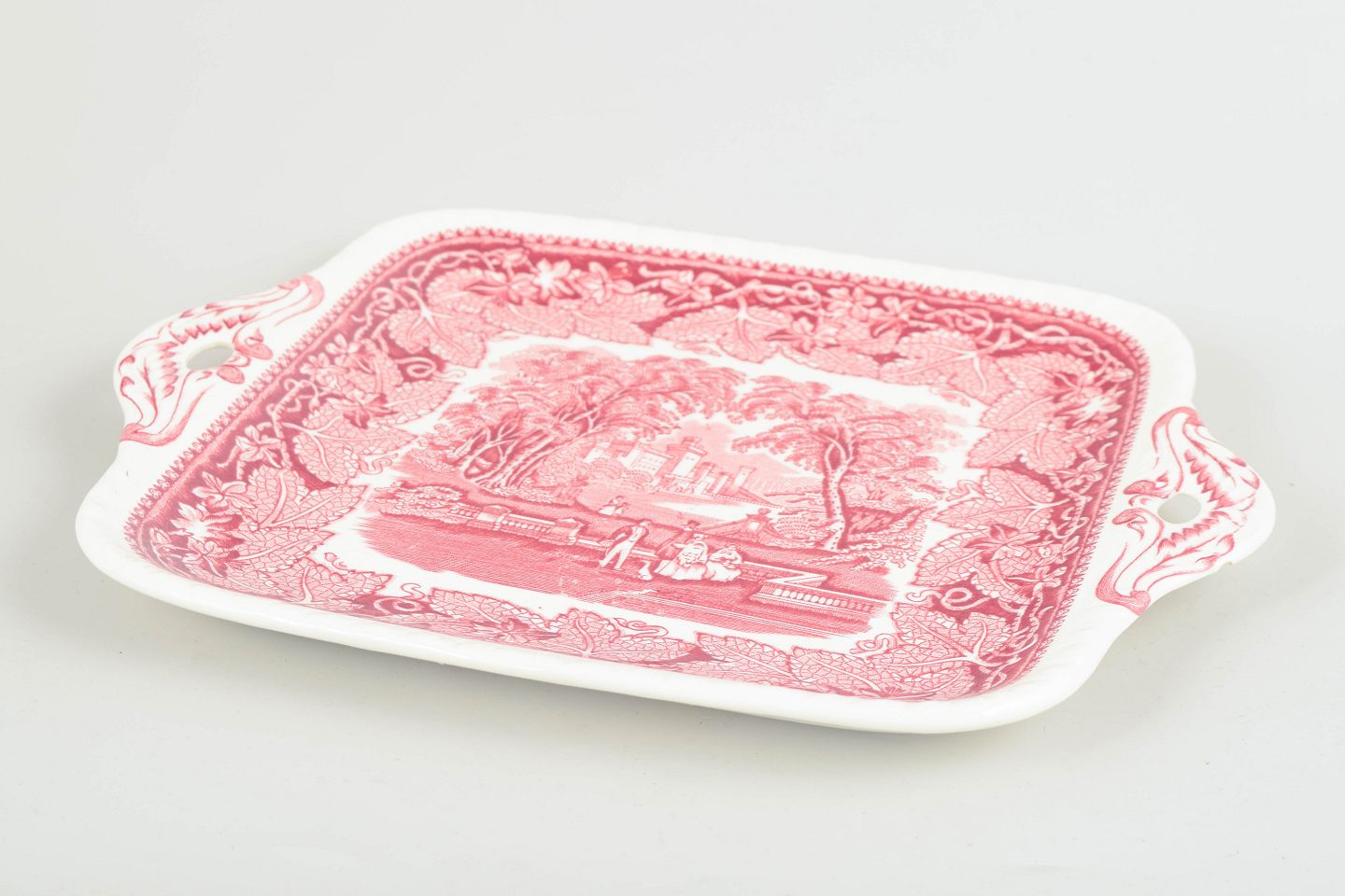 Rektangulær bakke i fajance fra Mason’s, dekoreret i rød transferware med landskabsmotiv og ornamental bladbort.