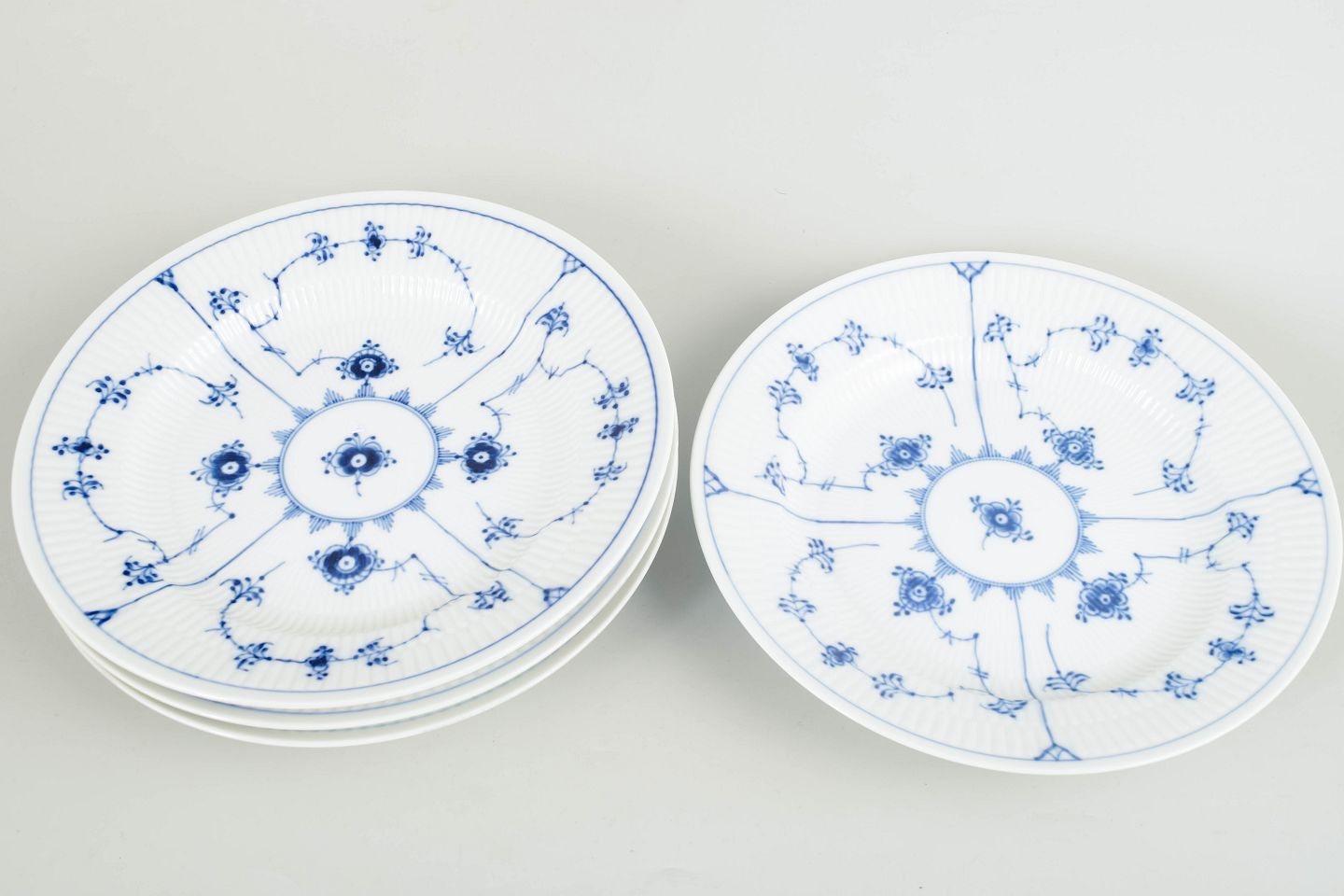 Set of 4 dinner plates in white porcelain decorated with hand-painted cobalt blue Blue Fluted Plain pattern. Model 1/175.