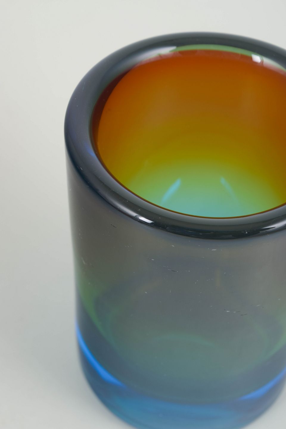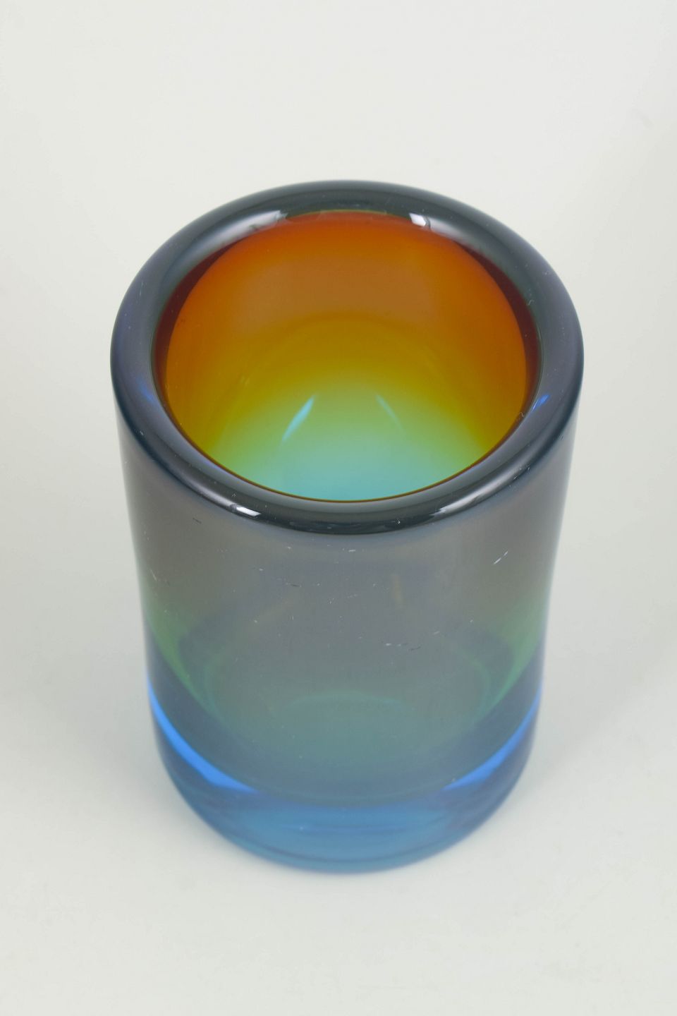 Cylindrisk kunstglasvase i kraftigt klart glas med flerfarvet overgang i blå, grønne og varme toner. Modellen er kendetegnet ved en tung bund og jævnt slebne kanter.