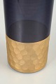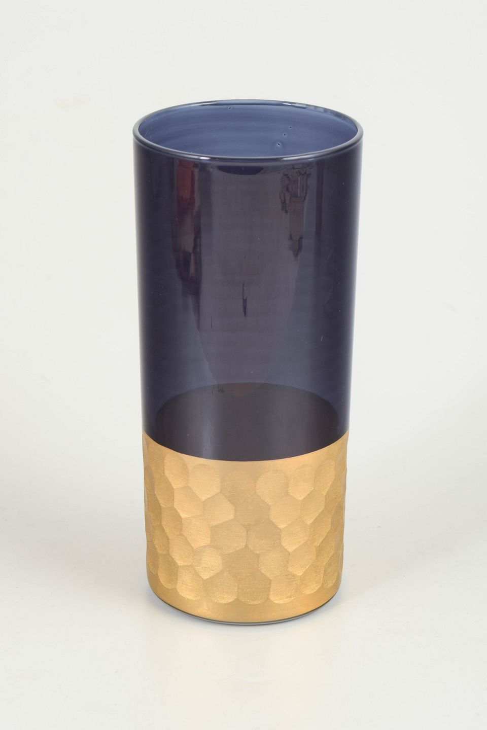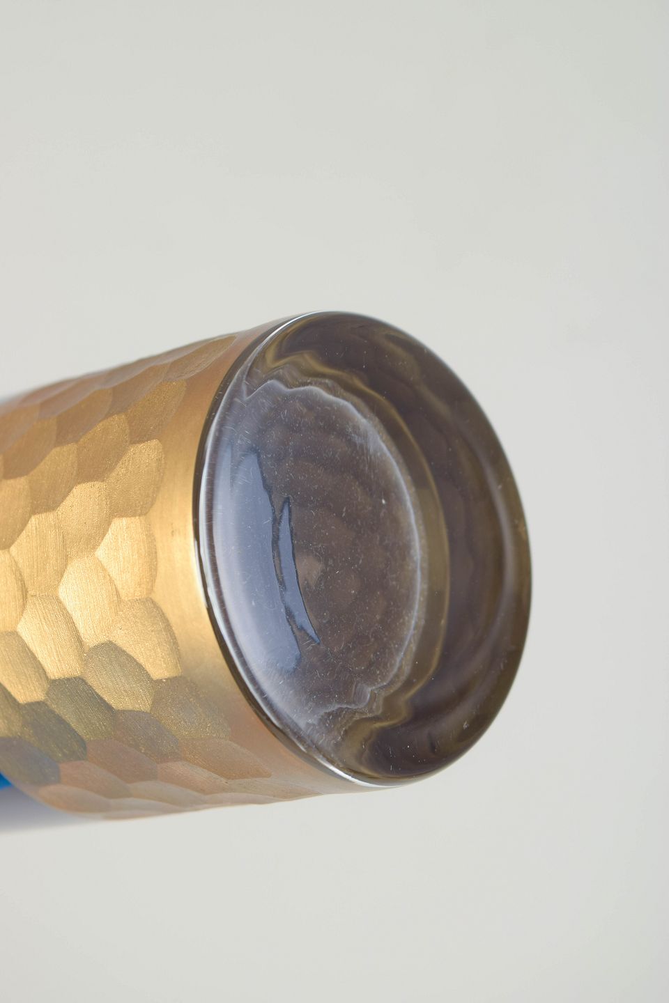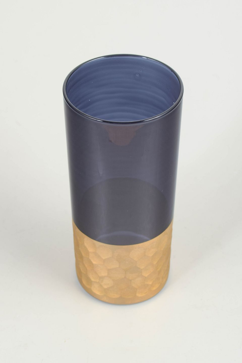 Cylinderformet vase i mundblæst glas med klar kobaltblå overdel og kraftig bund i hamret, forgyldt metal. Enkel, stram form med tydelig kontrast mellem det transparente glas og den teksturerede metalfod. Uden signatur.