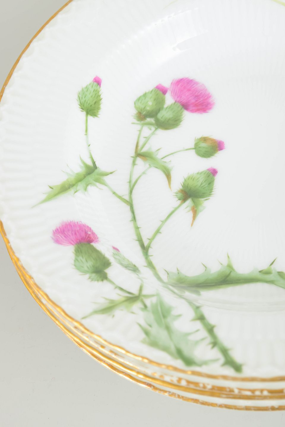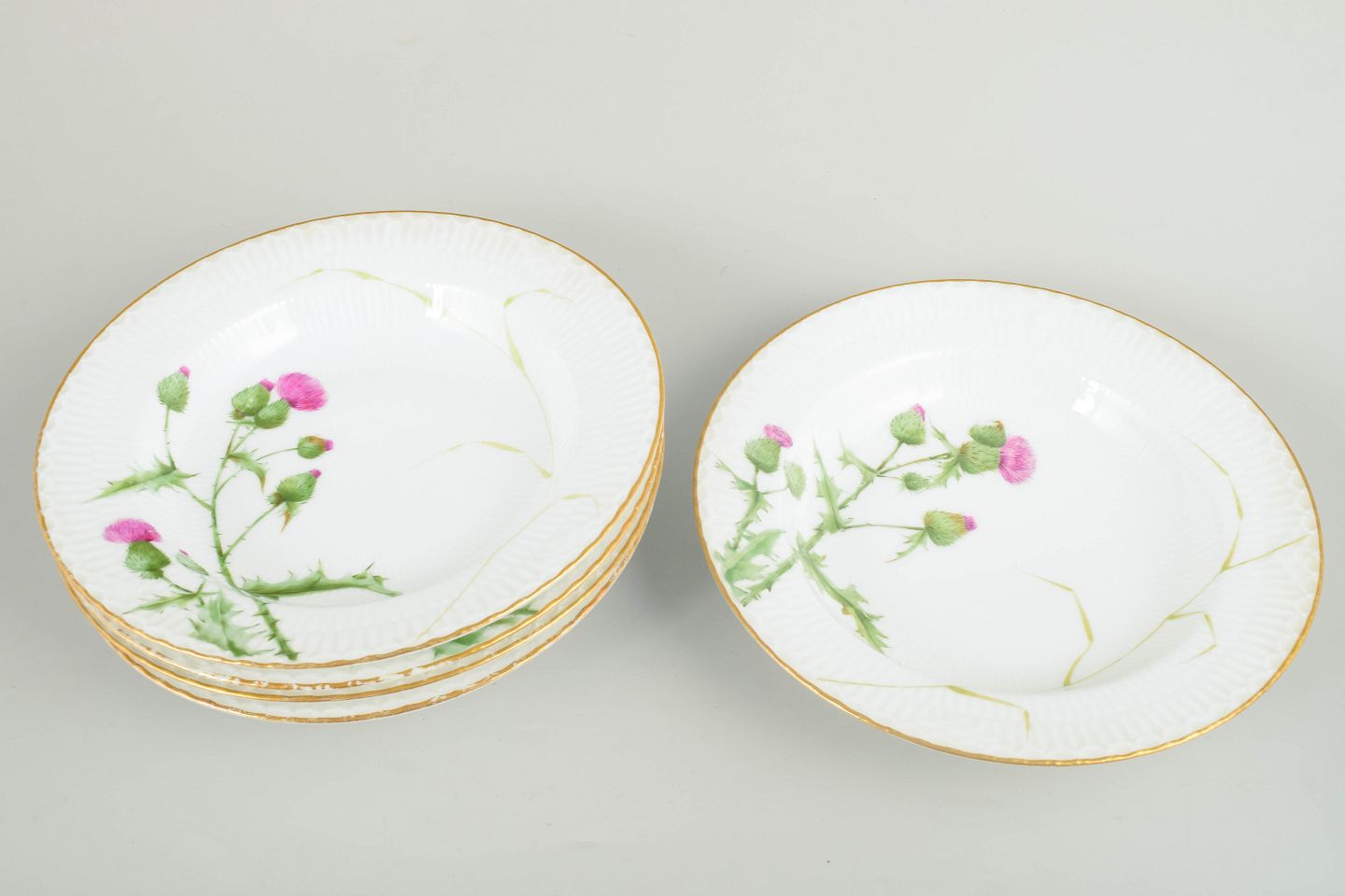Hand-painted porcelain deep plates decorated with a naturalistic thistle motif and a gilded rim. The plates feature a subtly ribbed surface and exemplify the high level of craftsmanship characteristic of Royal Copenhagen’s production in the second half of the 19th century.