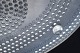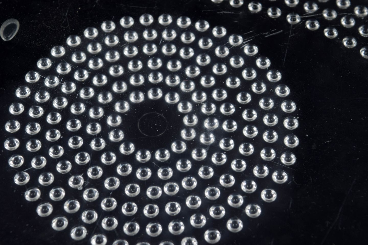 Large oval tray in clear art glass with concentric rings of knop relief and raised feet. Pressed glass.