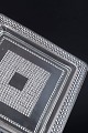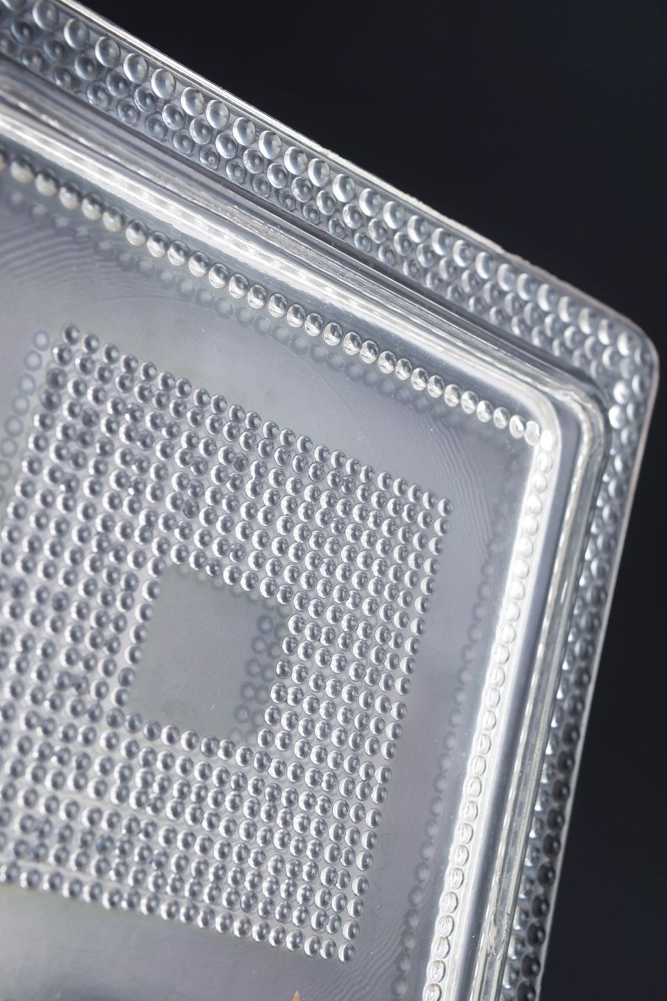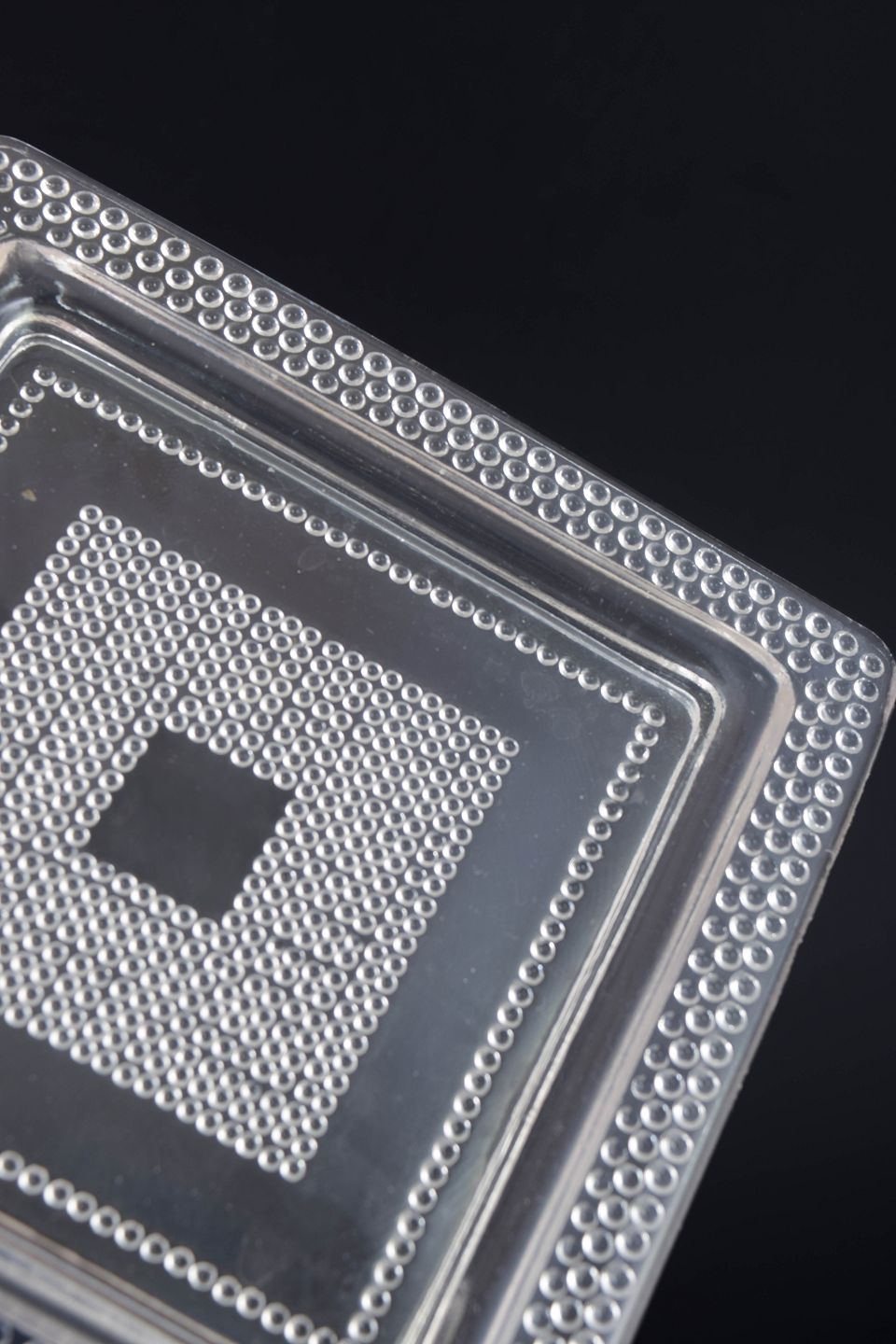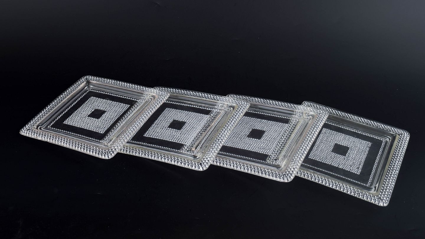 Set of four square plates in clear art glass with geometric relief and a defined central field. Pressed glass.