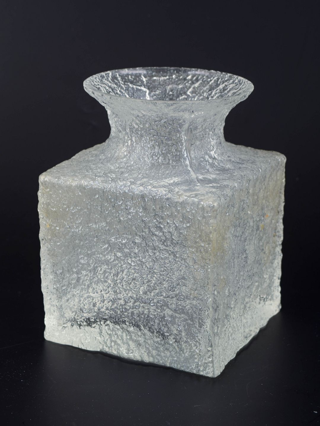 Sculptural art glass vase in clear pressed glass with a pronounced ice-crystal surface texture and a geometric body. The Krokus model is defined by its cubic form with a constricted neck and a broad, slightly flared rim. Unsigned.