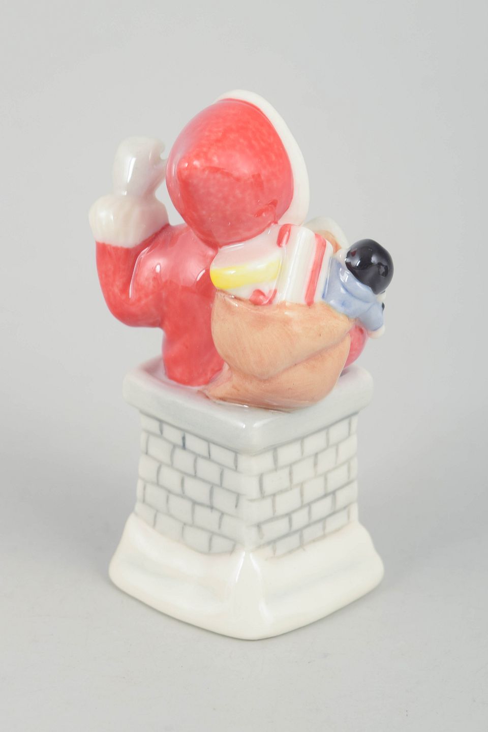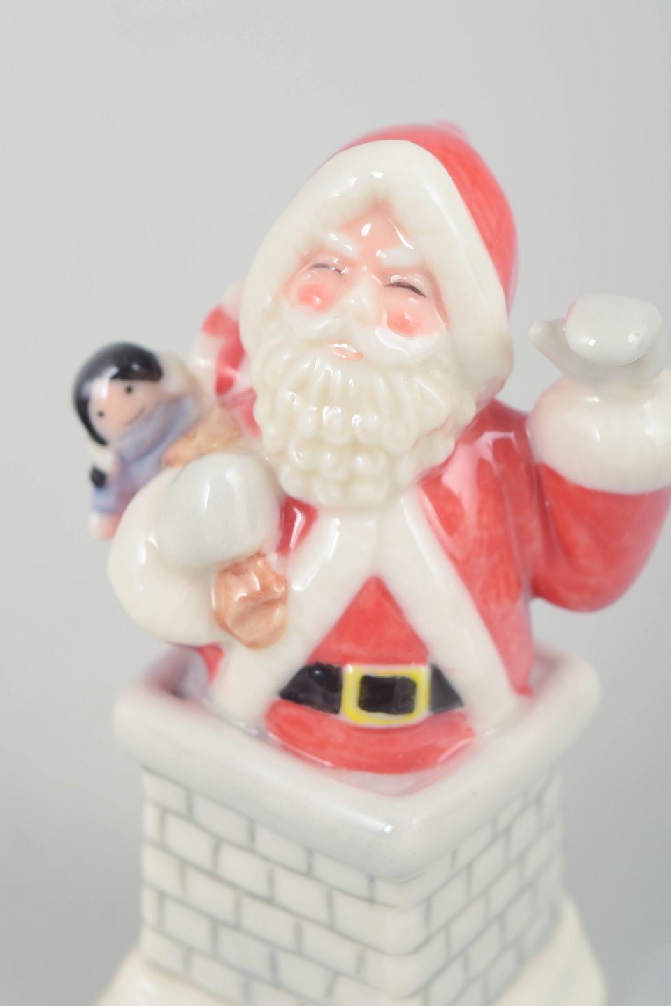 Dekorativ julemand figur i håndmalet porcelæn fra 2004, udført stående i skorsten med lille dukke i hånden. Figuren er detaljeret modelleret med klassisk rød dragt, hvid pelskant og sort bælte. Leveres med original æske. Første sortering.