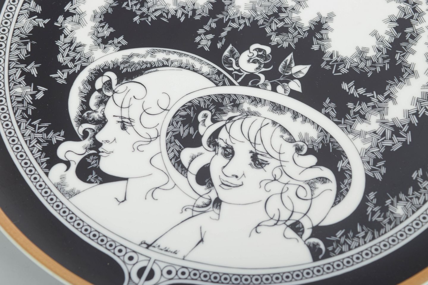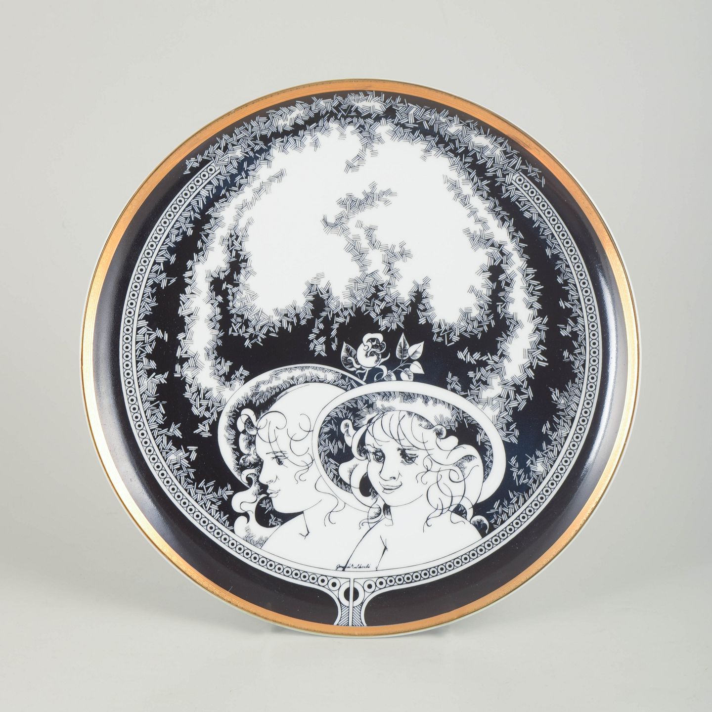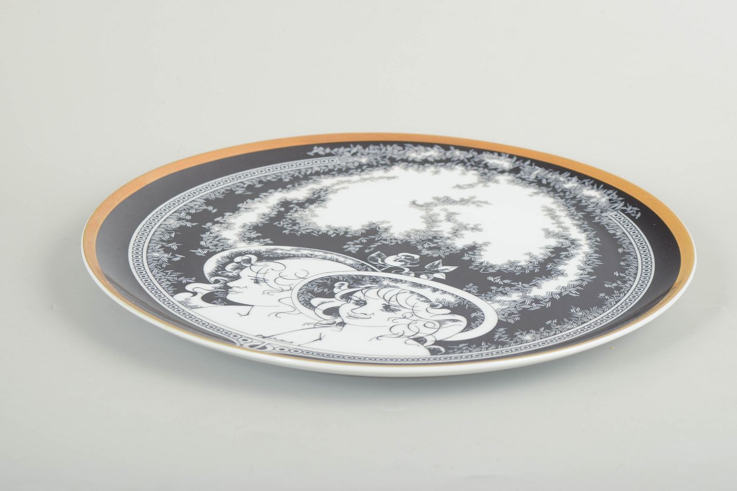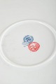 Stort rundt fad i hvidglaseret porcelæn med sort dekorationsbort og figurmotiv på låget. Fremstillet hos Hollóháza Porcelænsmanufaktur.