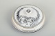 Rund skål med låg i hvidglaseret porcelæn med sort dekorationsbort og figurmotiv på låget. Fremstillet hos Hollóháza Porcelænsmanufaktur.