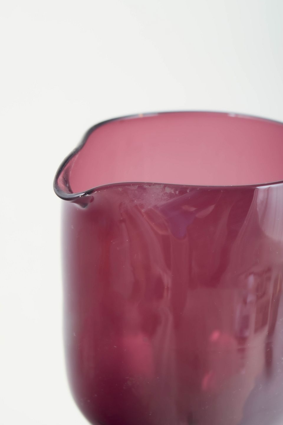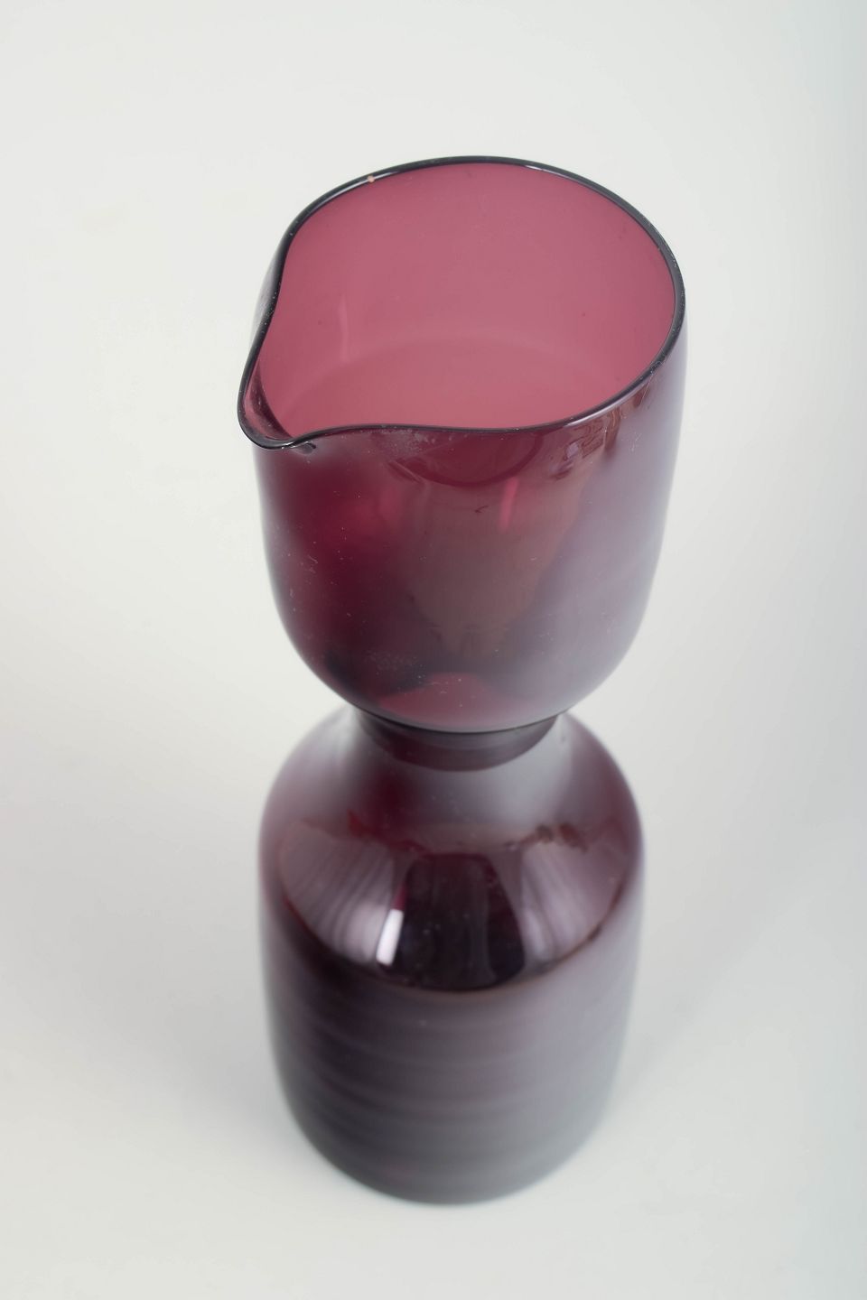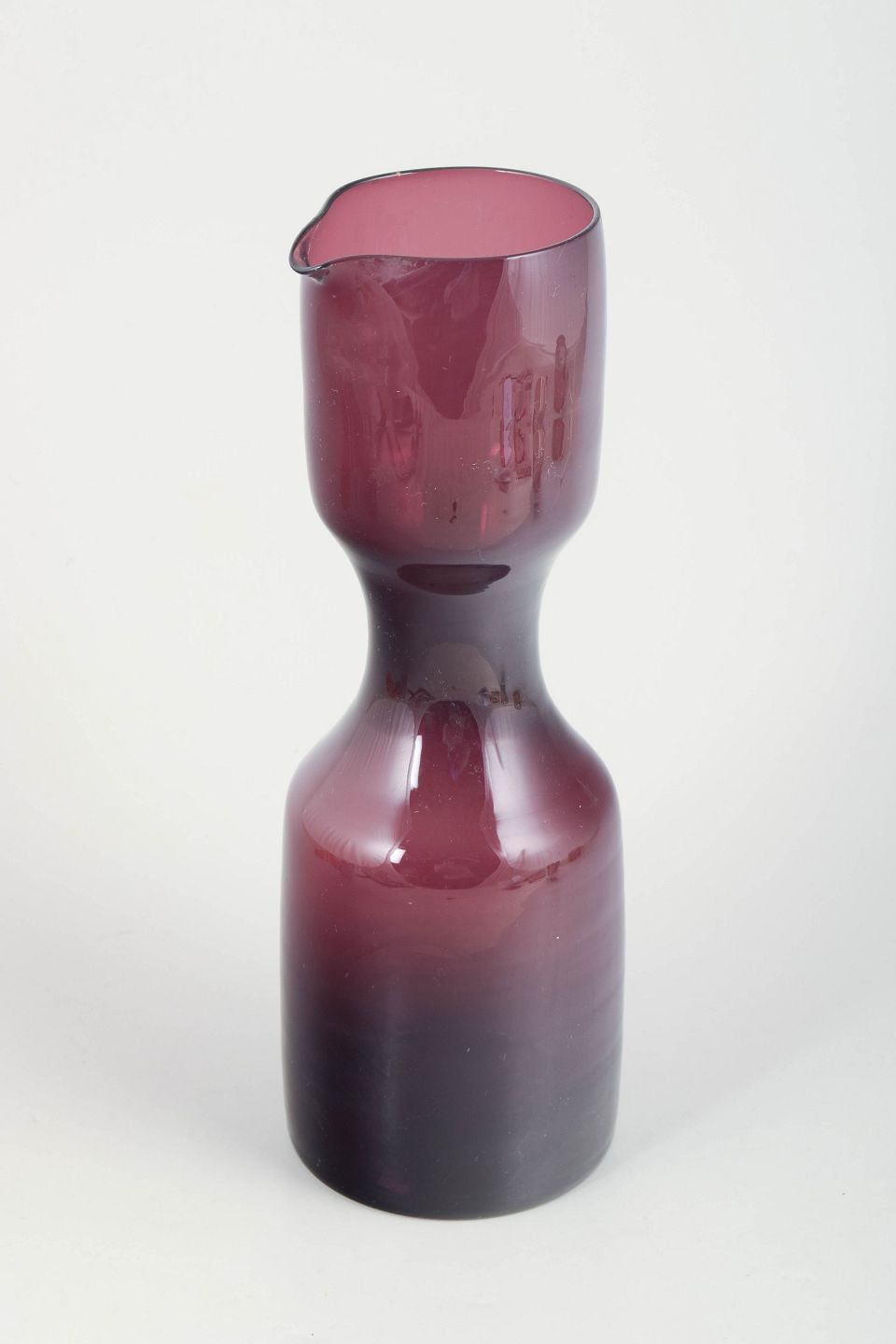 Slank, timeglasformet kande i mundblæst glas med let indsvajet hals og diskret hældetud. Udført i transparent purpurfarvet tone med mørkere bundparti, karakteristisk for svensk glasdesign fra 1960’erne.
