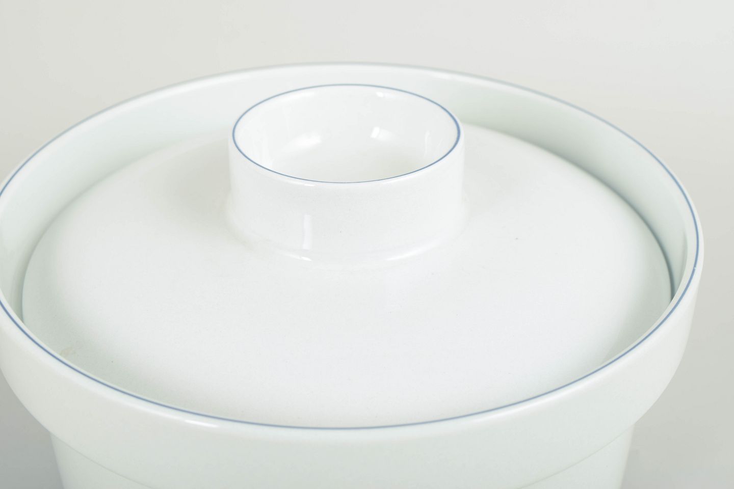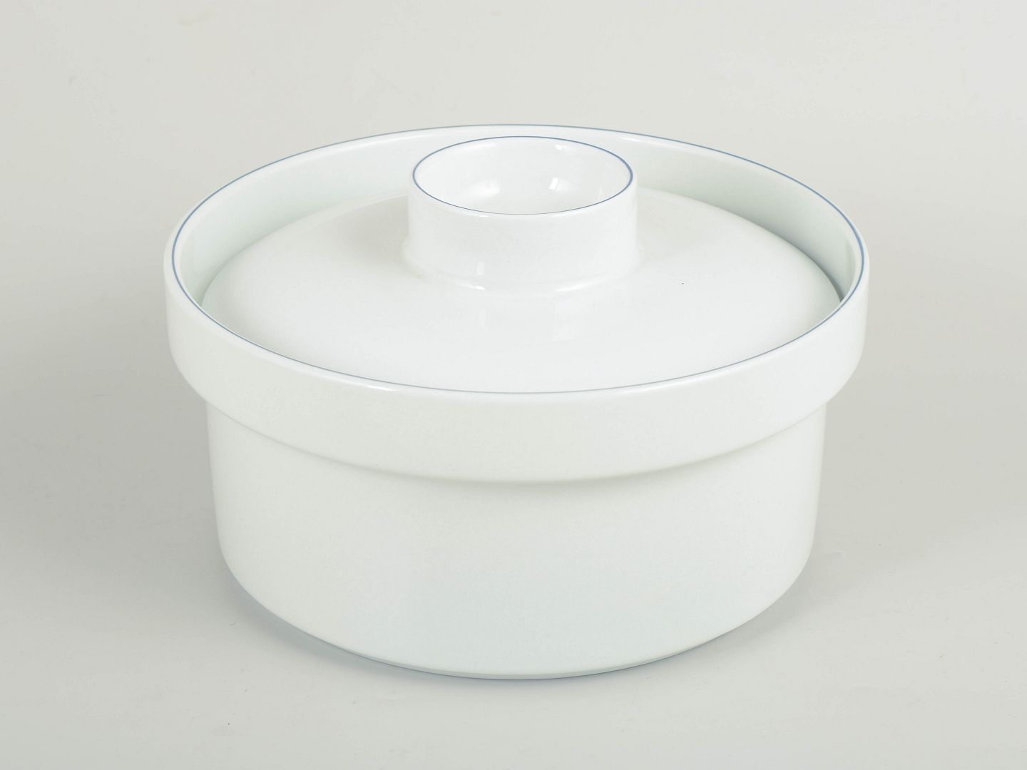 Lågterrin model 174 i hvid fajance med enkel blå rand langs låg og kant. En del af Blåkant-serien med sit stringente og funktionelle formsprog. Fremstillet 1992–1999. 1. sortering.