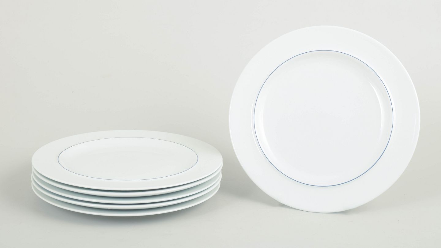 Six round plates model 621 in white faience with a simple blue line along the rim. Part of the Blue Line series with its strict and functional design language. Produced 1992–1999. 1st factory quality.