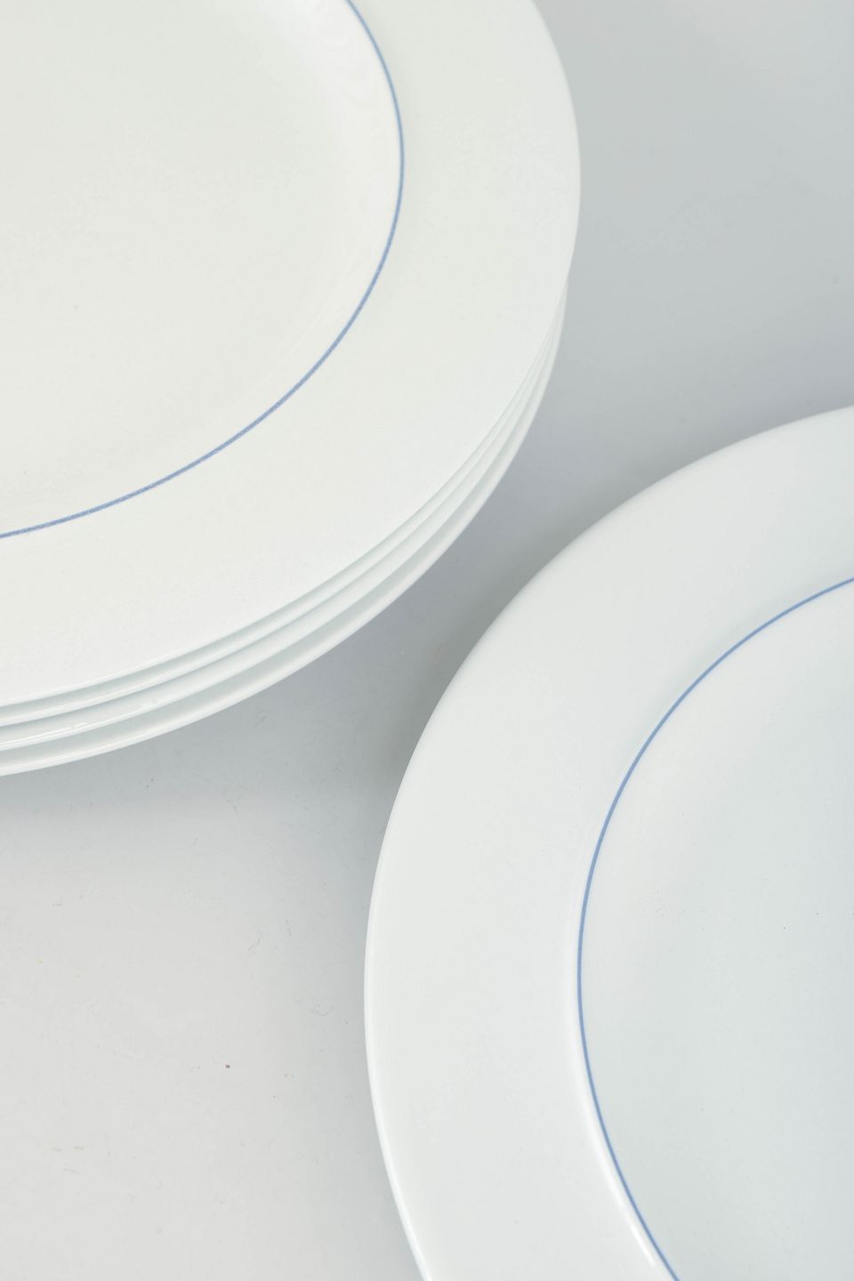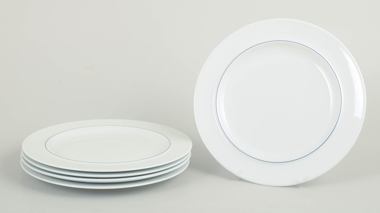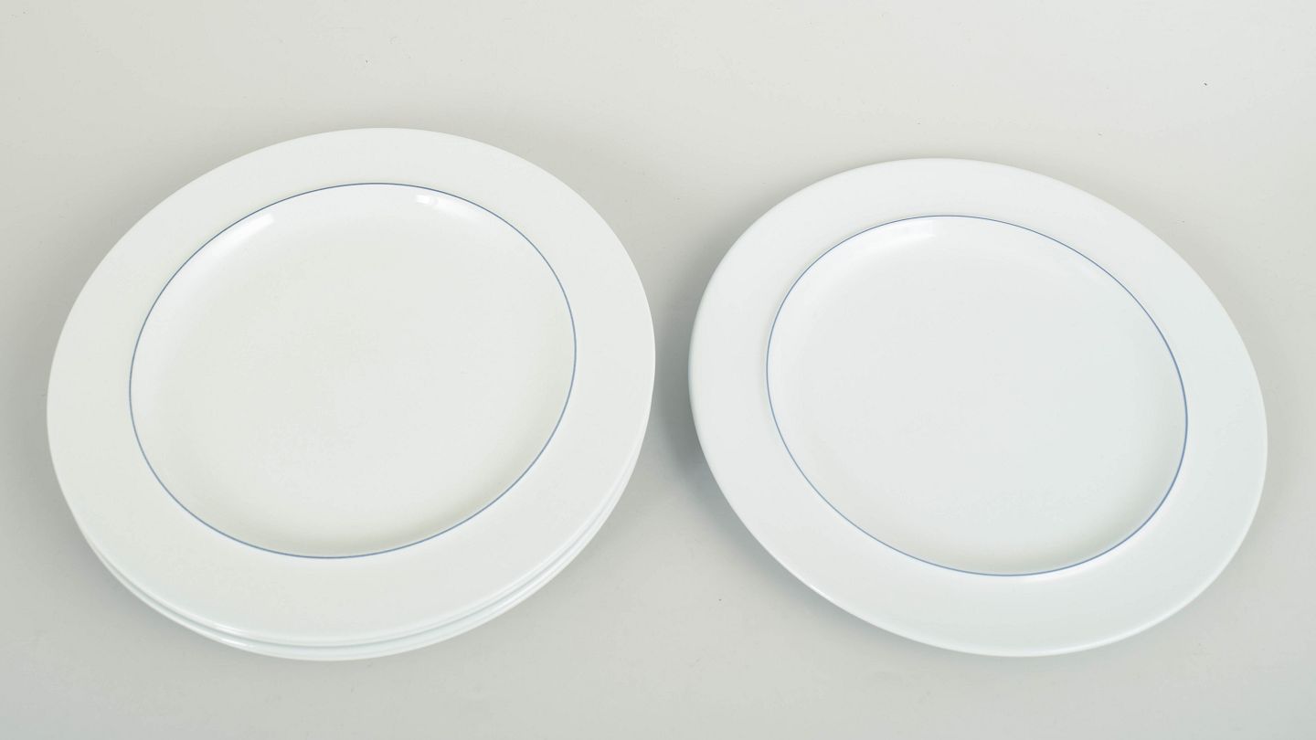 Five round plates model 621 in white faience with a simple blue line along the rim. Part of the Blue Line series with its strict and functional design language. Produced 1992–1999. 1st factory quality.
