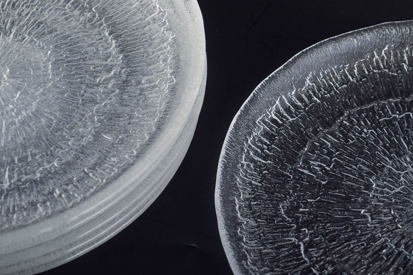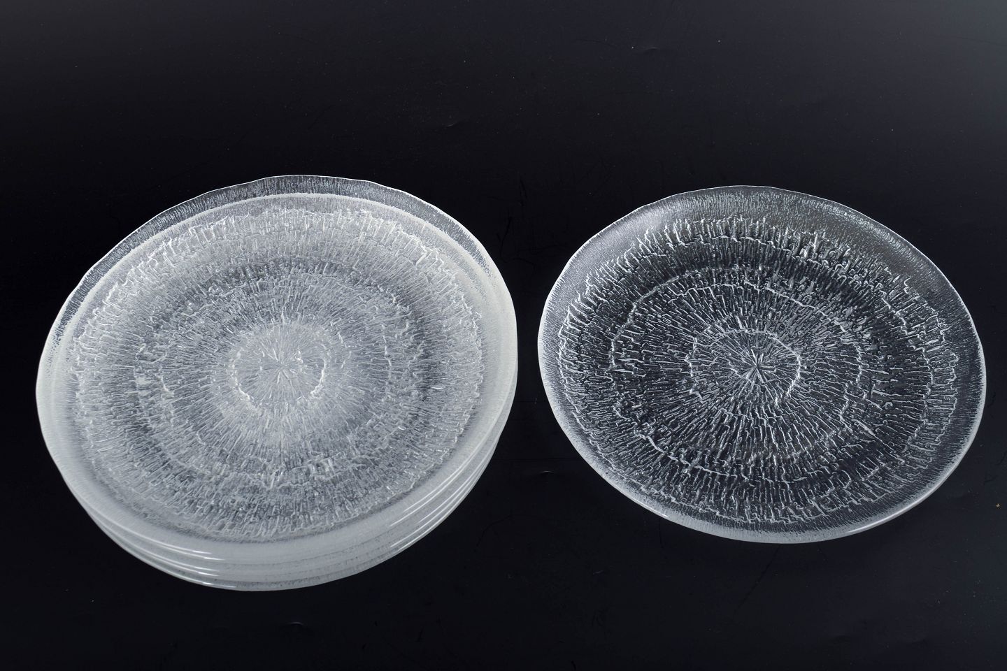 Set of six pressed clear glass plates from the Ultima Thule series, defined by its distinctive heavily textured surface inspired by melting ice and Arctic landscapes. Unmarked.