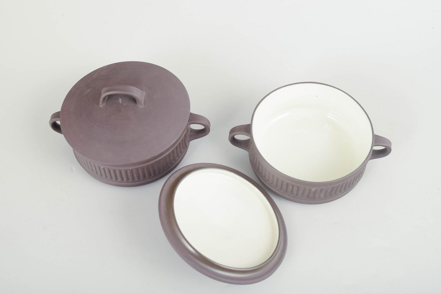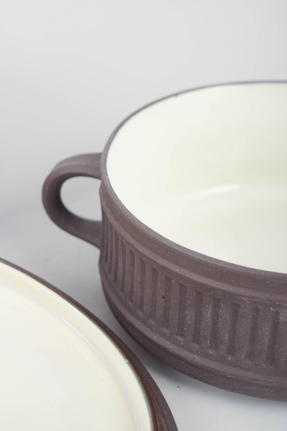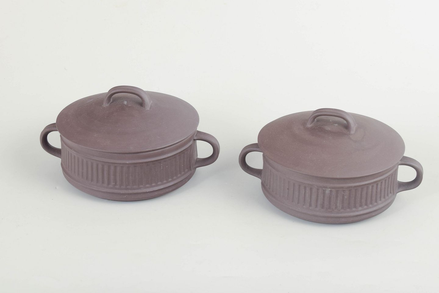 Two stoneware bouillon cups with lids and side handles, executed in a white glaze with ribbed decoration.