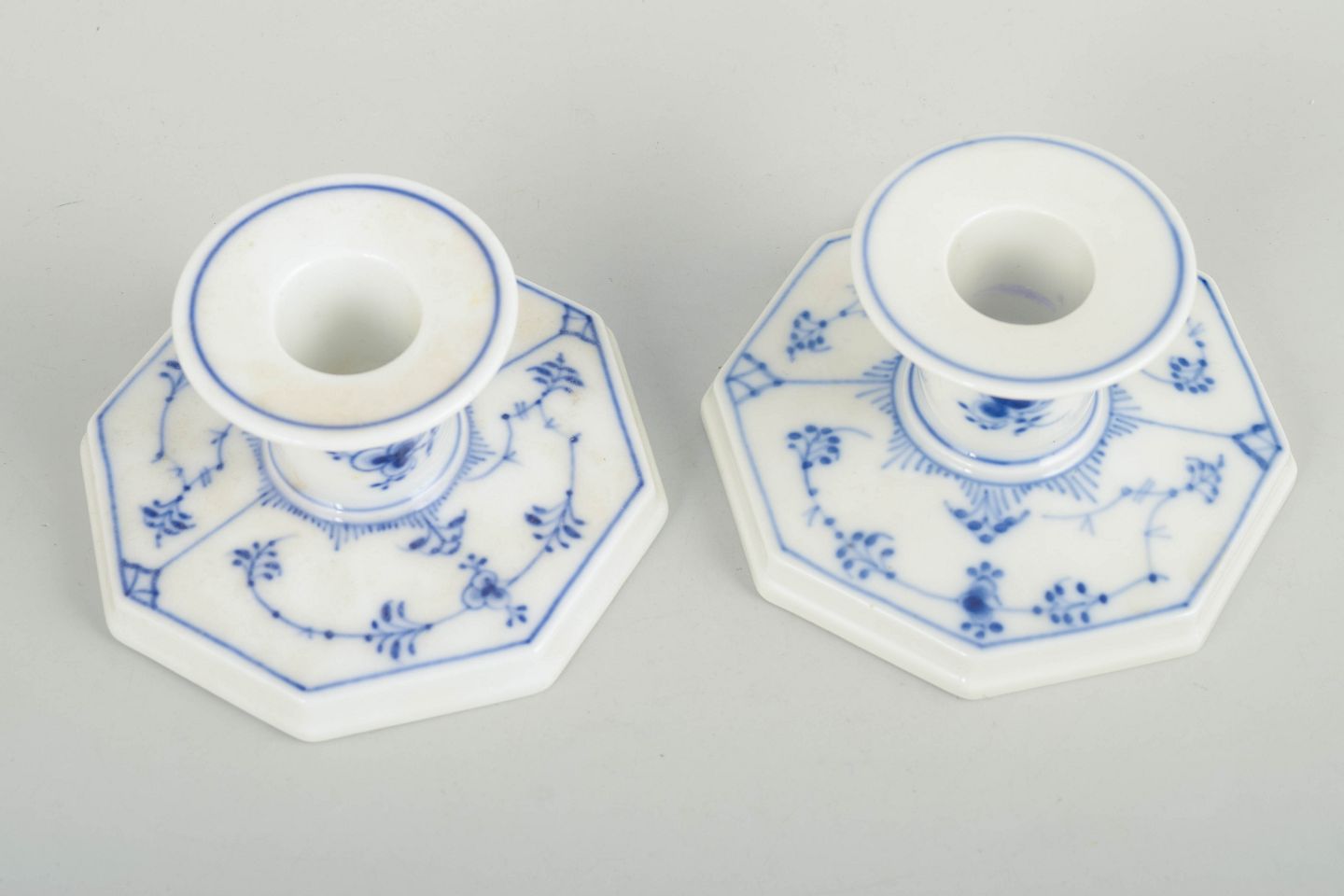 Pair of hand-painted porcelain candlesticks from the Blue Fluted Plain service with classic underglaze decoration in cobalt blue. Model 1/3334. One is first factory quality, the other cancelled with one incised line to the base. Produced in 1963.