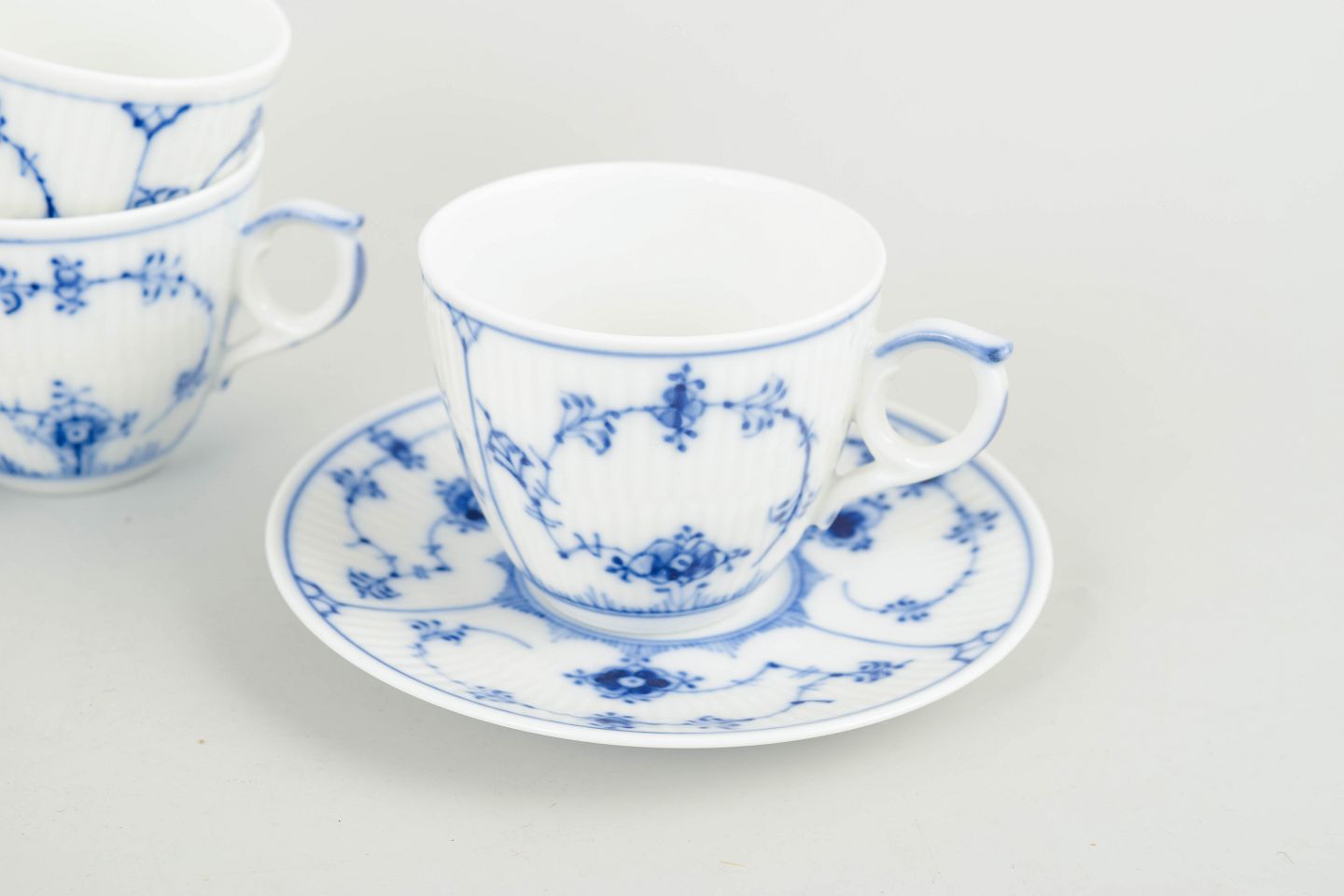 Royal Copenhagen Musselmalet Riflet, sæt af fire mokkakopper med underkopper.