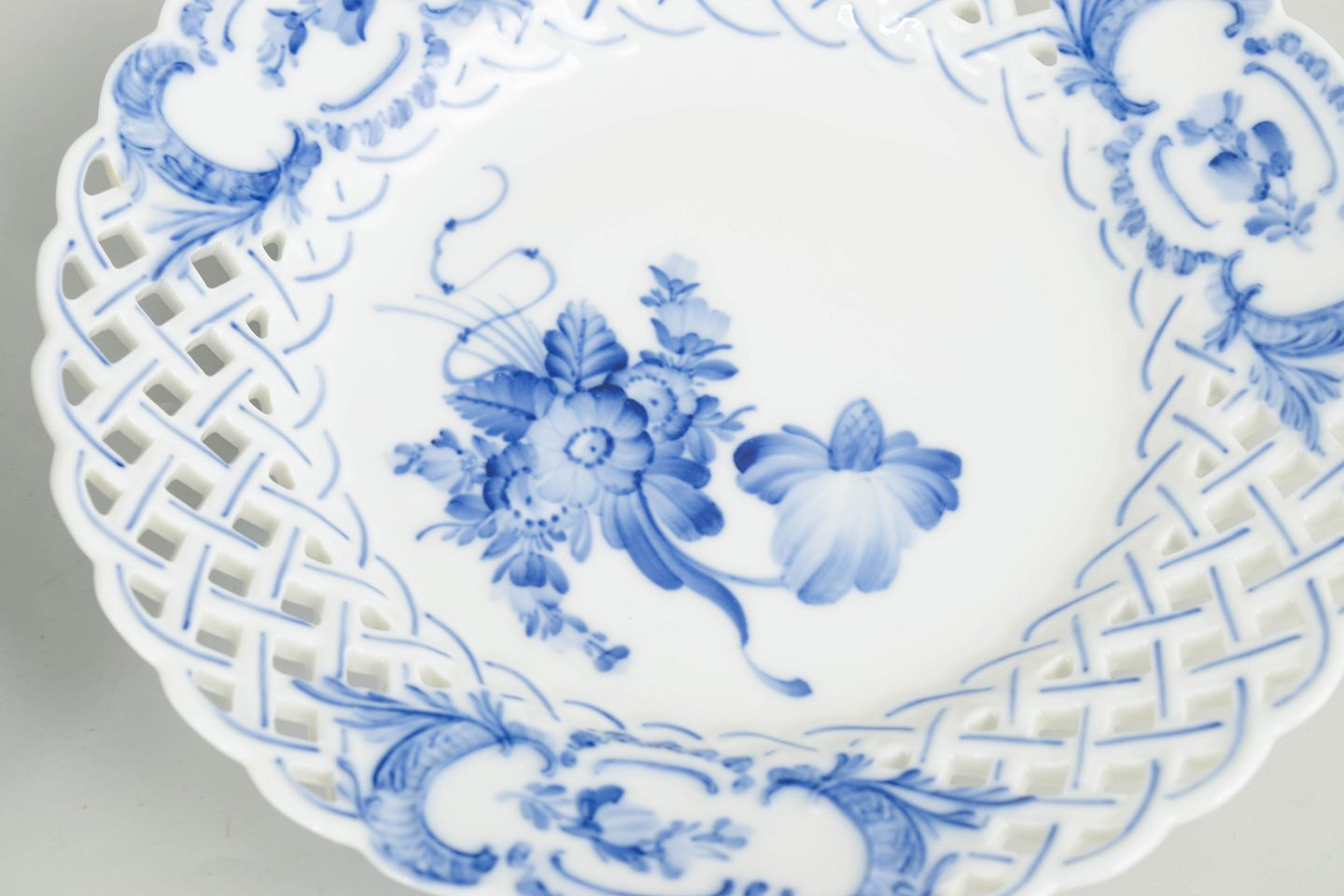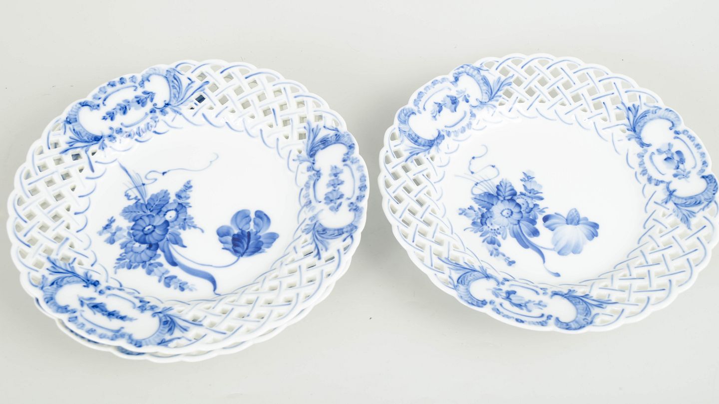 Royal Copenhagen was founded in 1775 in Copenhagen under royal patronage. The factory is internationally recognised for its hand-painted porcelain and high artistic standards. Blue Flower was introduced in the eighteenth century and continued into the twentieth century, characterised by its naturalistic floral decoration and distinctive pierced rim.