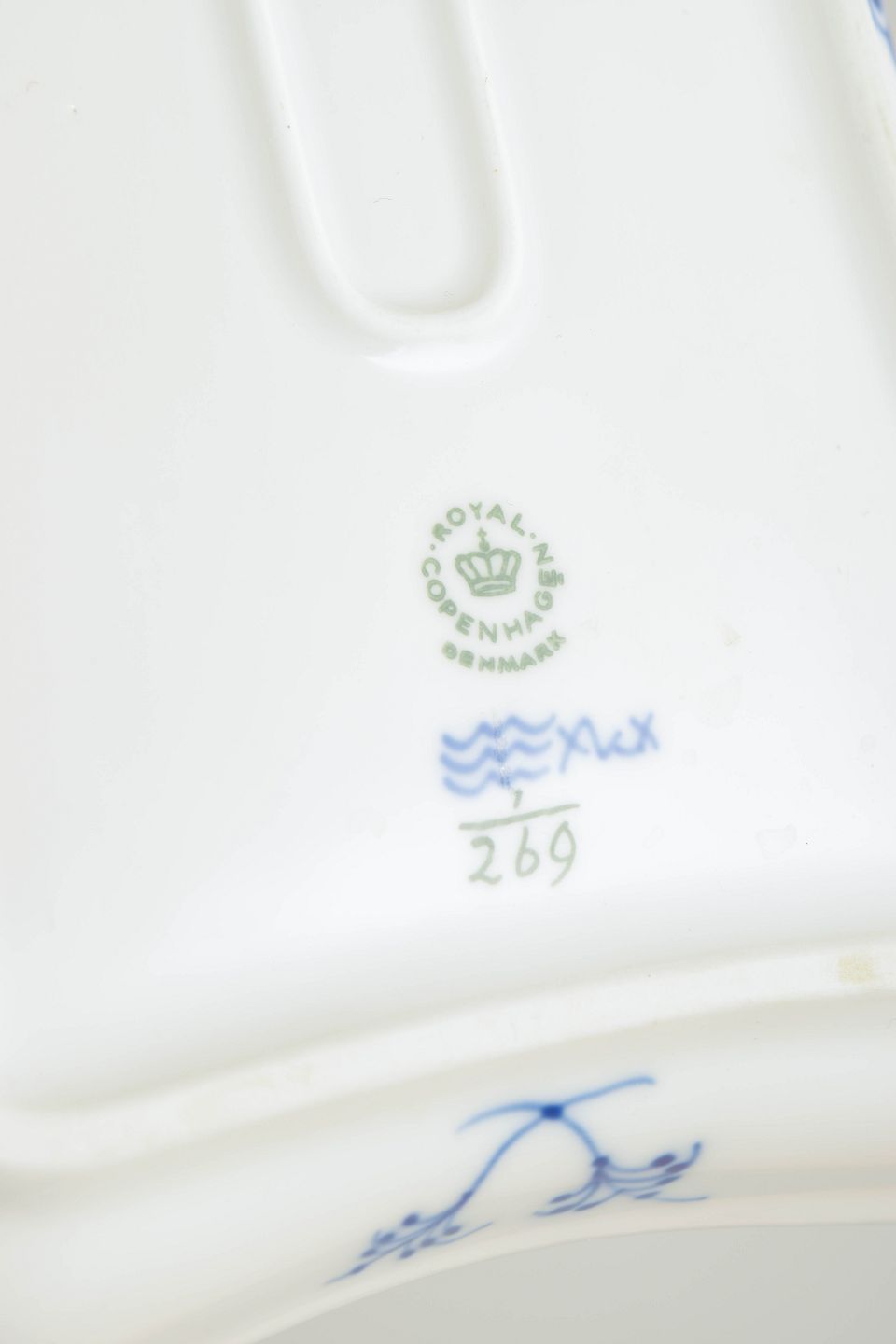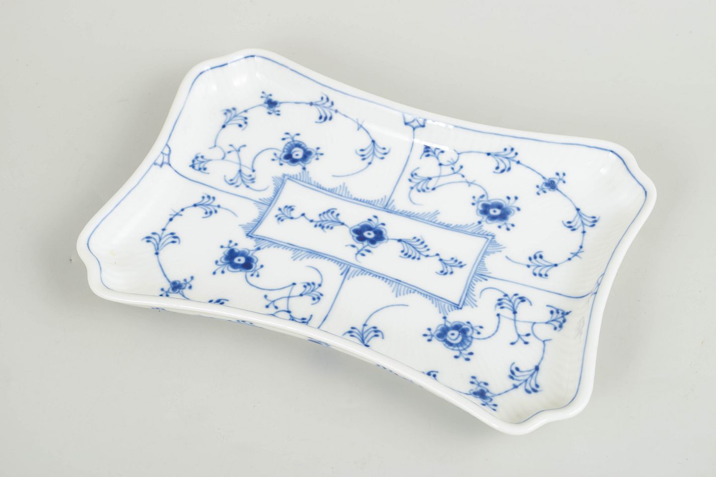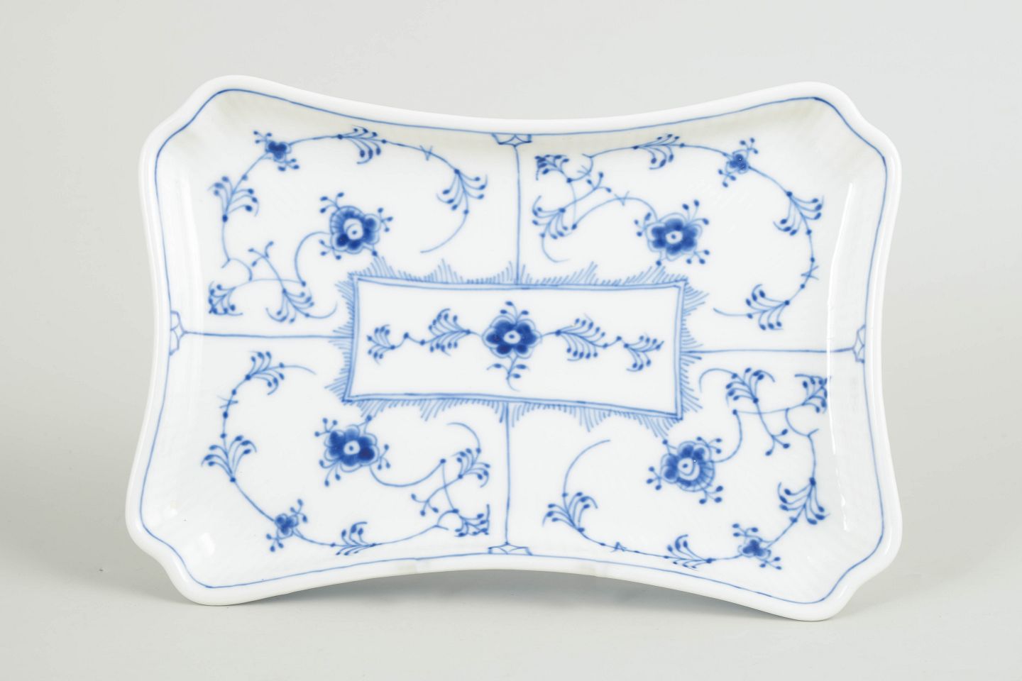 Tray in hand-painted porcelain from the Blue Fluted Plain service with classic underglaze cobalt blue decoration and fluted surfaces. Model 1/269. H. 16 cm, D. 24 cm. Cancelled with one incised line on the base. Produced in 1965.