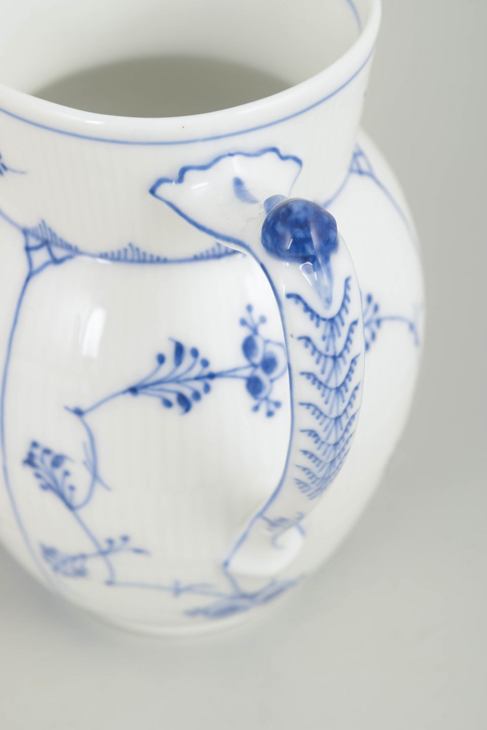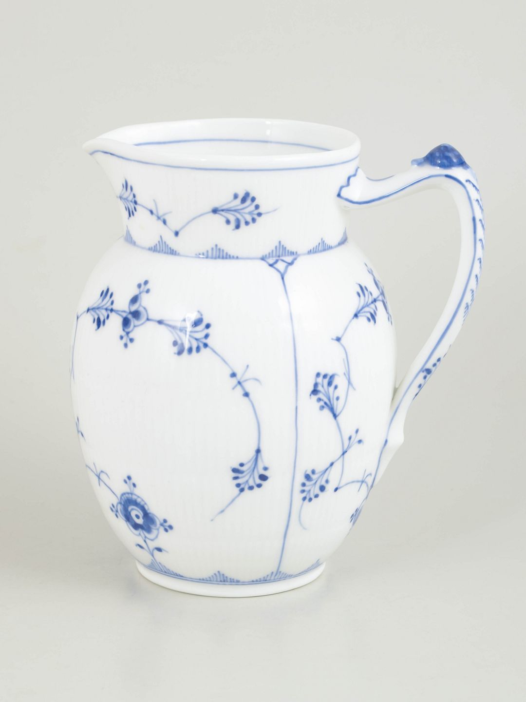 Pitcher in hand-painted porcelain from the Blue Fluted Plain service with classic underglaze cobalt blue decoration and fluted surfaces. Model 1/161. Cancelled with one incised line on the base. Produced in the 1920s.
