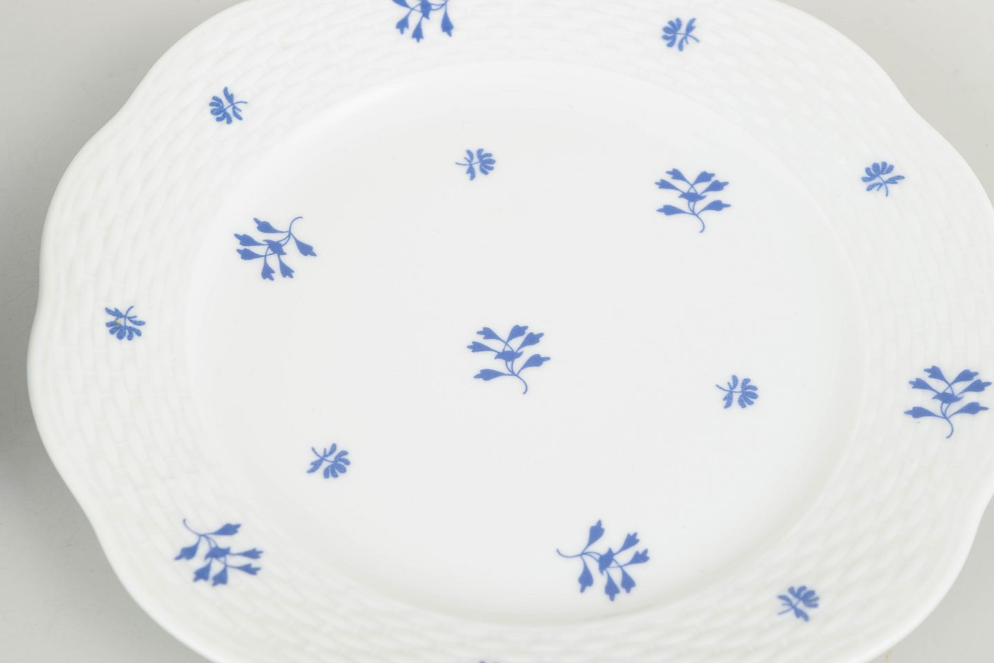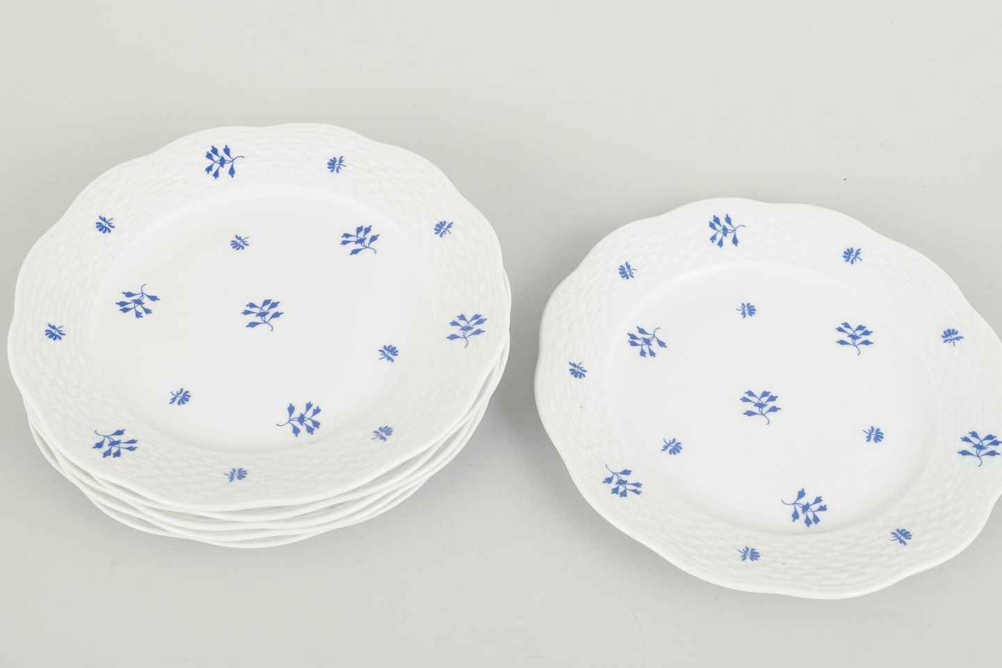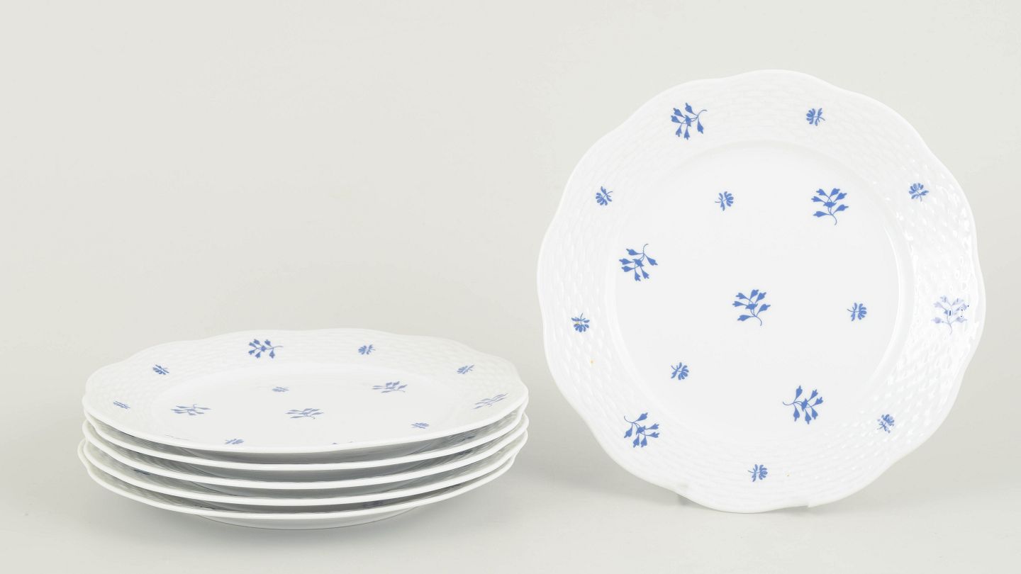 Elegant set of six hand-painted porcelain plates from Herend featuring a delicate blue floral motif scattered across the rim and centre. The gently scalloped edge and subtle relief pattern create a refined and classical appearance, characteristic of the manufactory’s interwar production. A harmonious and decorative service in a smaller format.