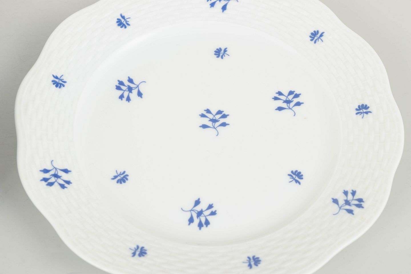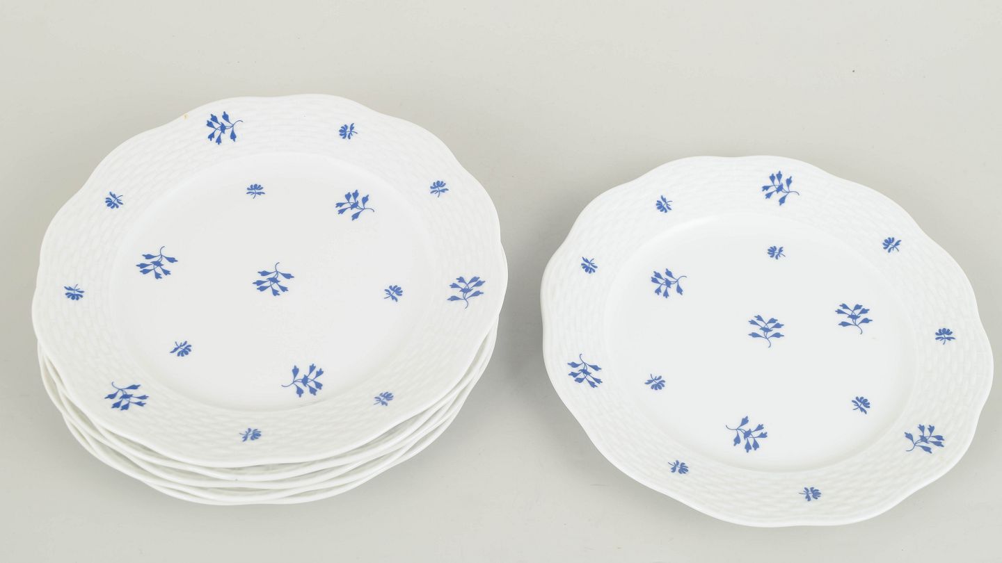 Elegant set of six hand-painted porcelain plates from Herend featuring a delicate blue floral motif scattered across the rim and centre. The gently scalloped edge and subtle relief pattern create a refined and classical appearance, characteristic of the manufactory’s interwar production. A harmonious and decorative service in a smaller format.