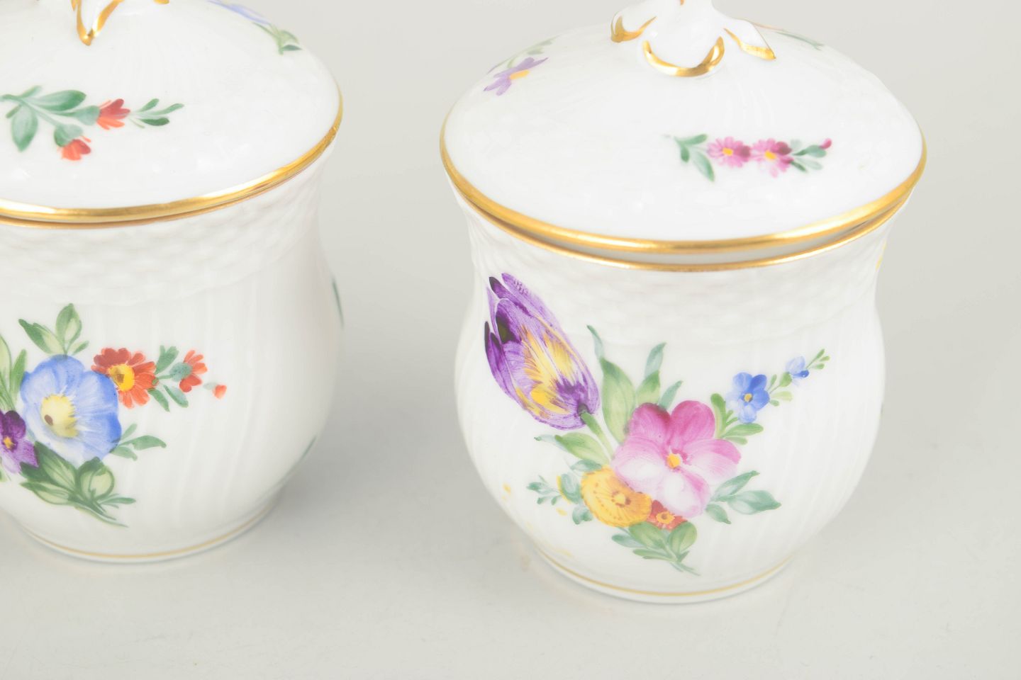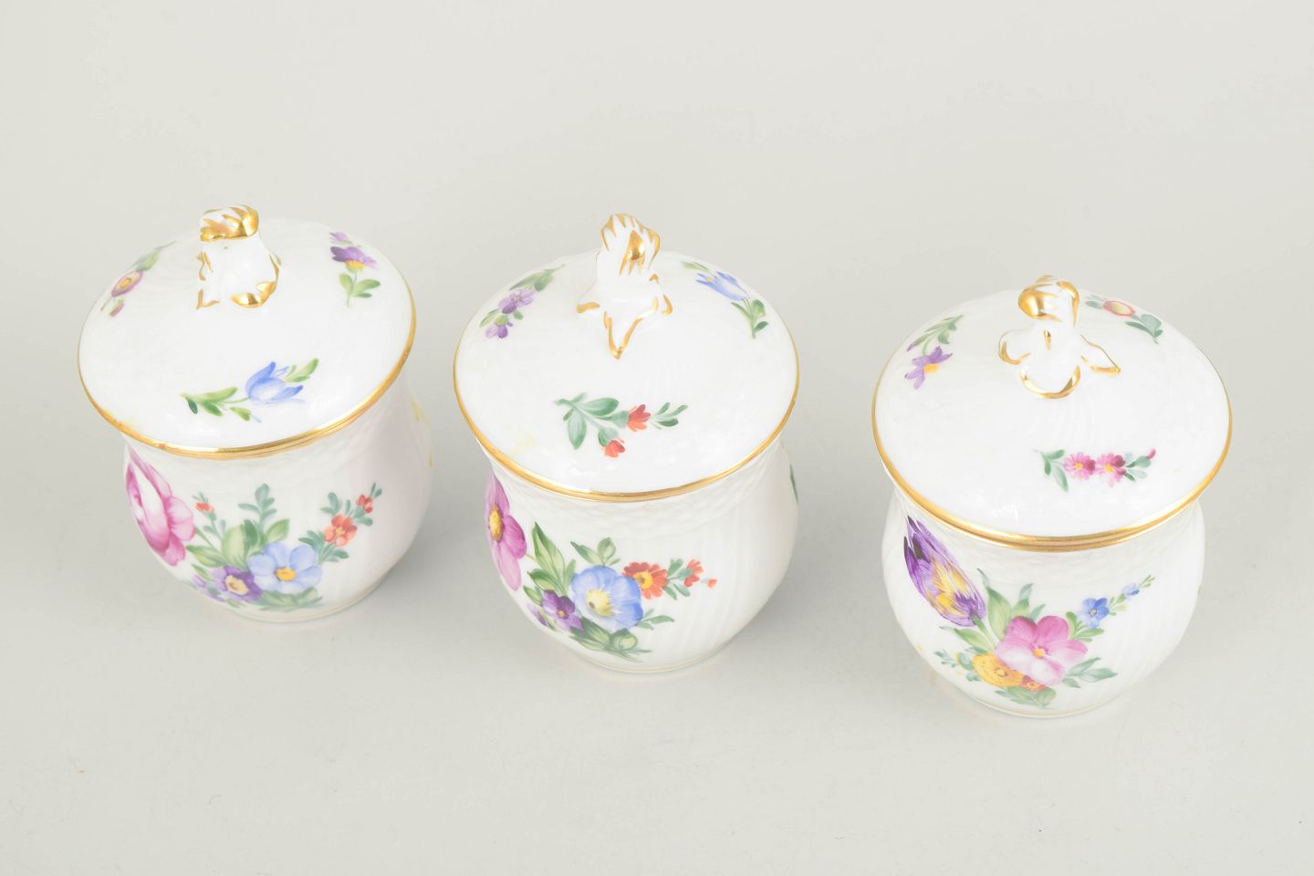 Royal Copenhagen, saksisk blomst sæt af tre cremekopper med tilhørende låg.