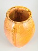 Stor balusterformet vase i glaseret lertøj med reliefdekorerede lodrette felter og bølgende ornamentik. Udført i lys gul glasur med varme orange nuancer og levende variation i overfladen. Signeret HAK i bunden.