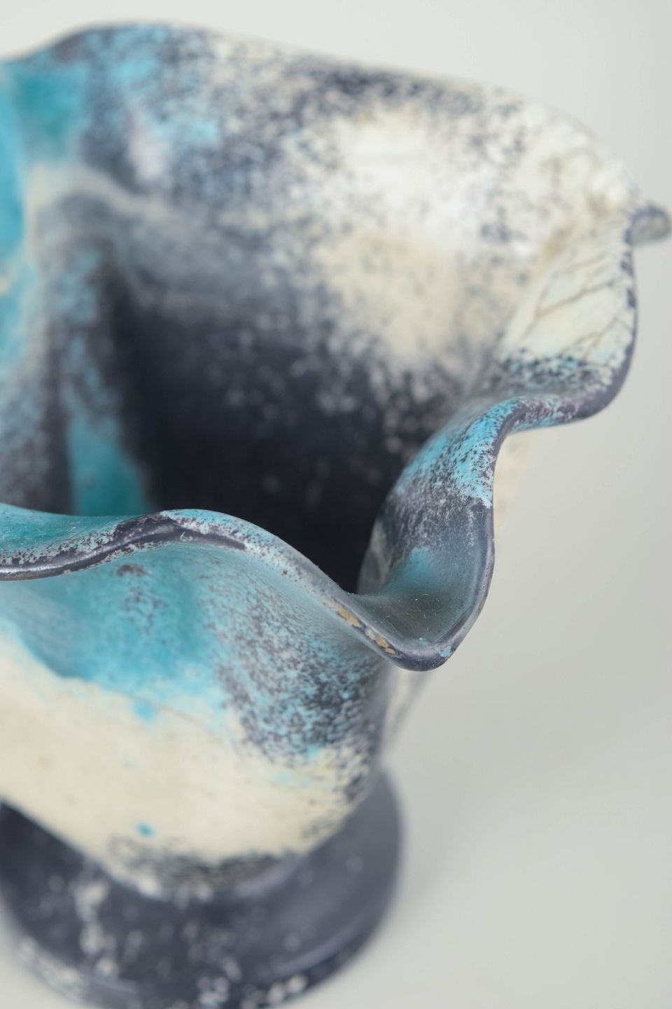 Decorative vase in glazed earthenware with a characteristic wavy rim and foot. Executed in a double glaze with green, turquoise, white and black tones, where the glaze flows dynamically across the surface creating a strong artistic expression.