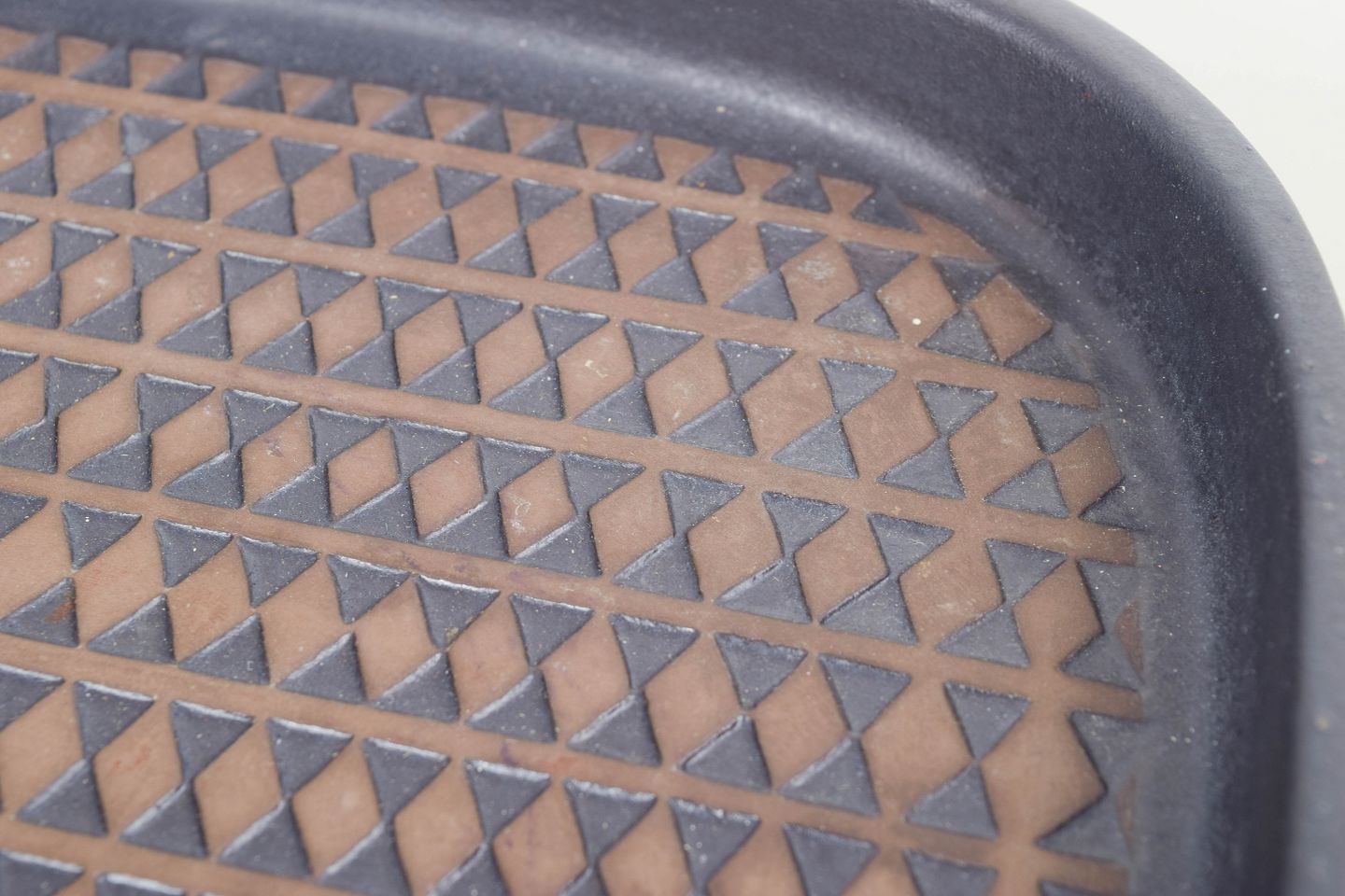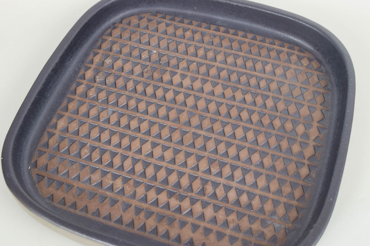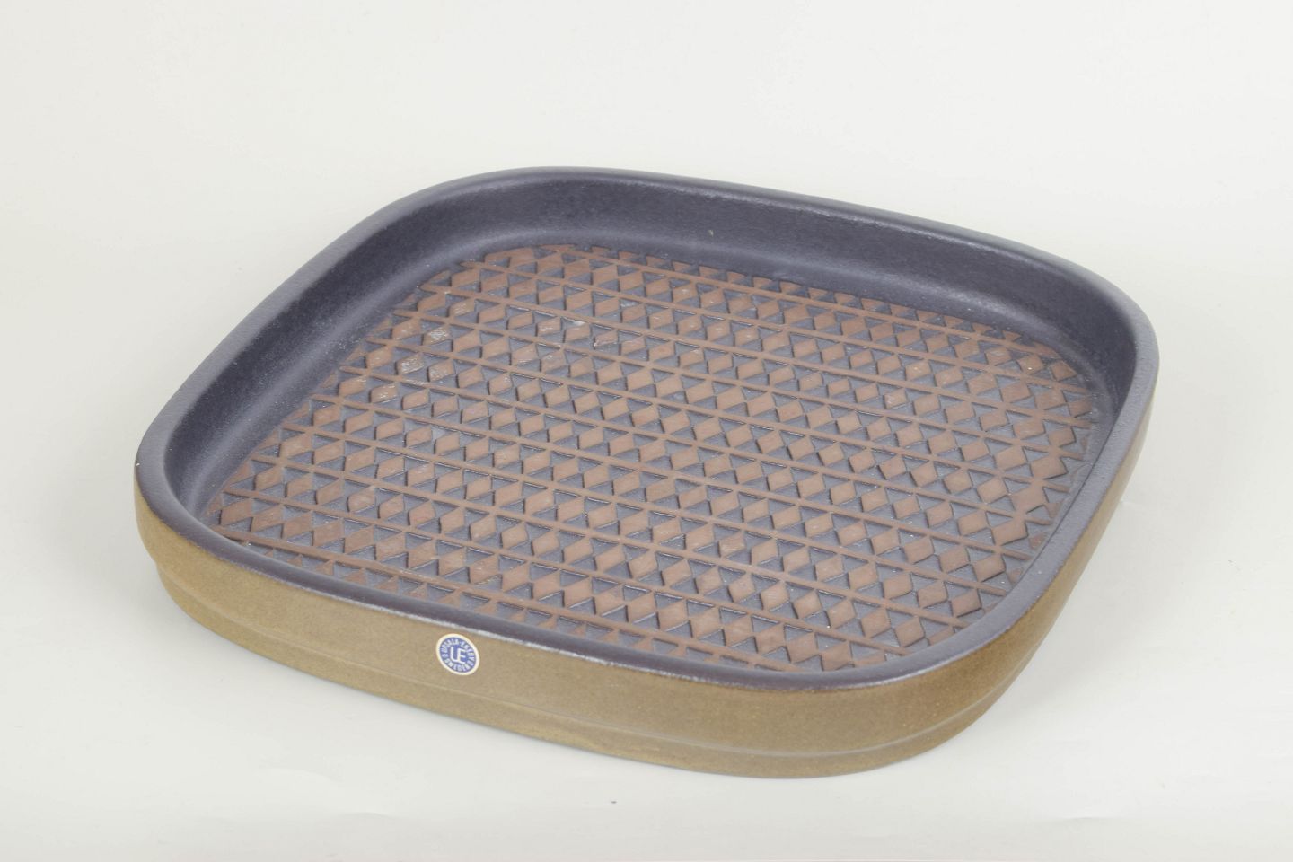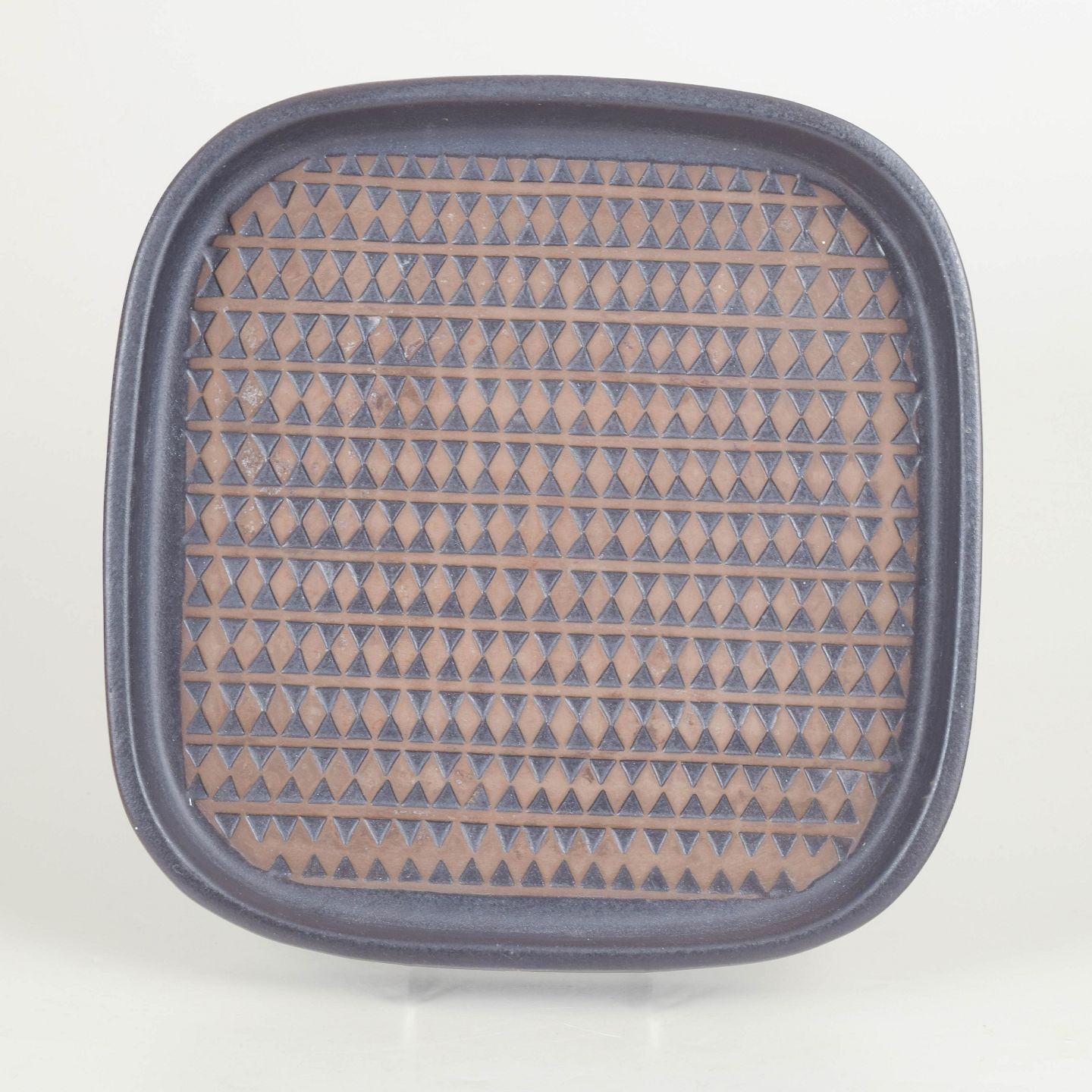 Stort kvadratisk fad i stentøj med afrundede hjørner og dekorativ overflade med gentaget trekantsmønster i brun og blå glasur. Let relief og karakteristisk grafisk udtryk. Med original etiket. Model 4095M.