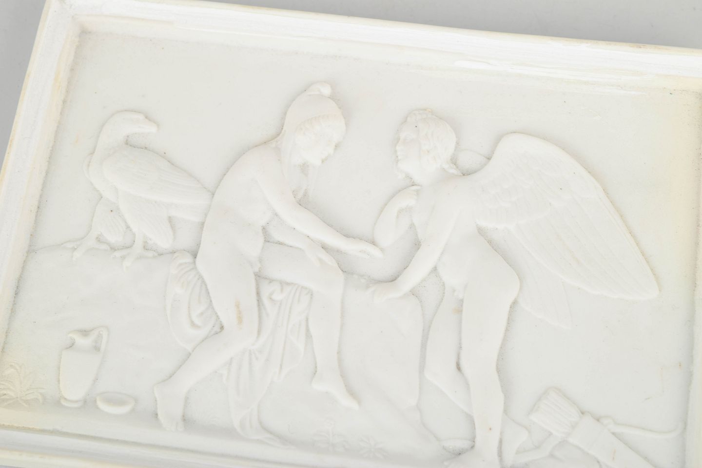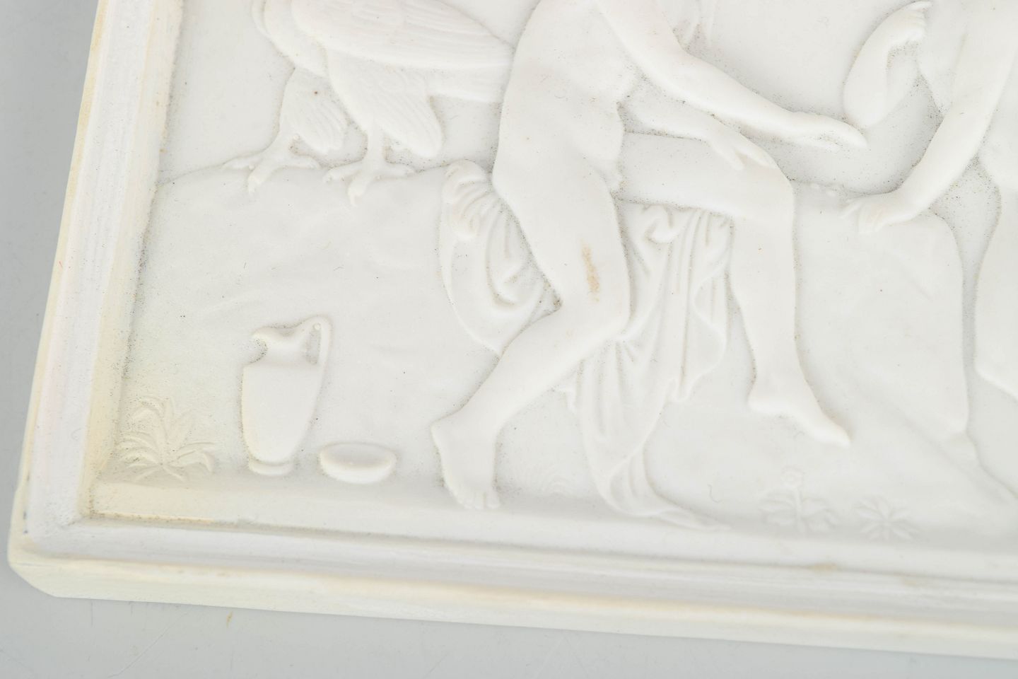 Rectangular wall relief in white biscuit porcelain depicting a classical composition with putti after Bertel Thorvaldsen, executed with refined detailing and soft modelling in the neoclassical style.
