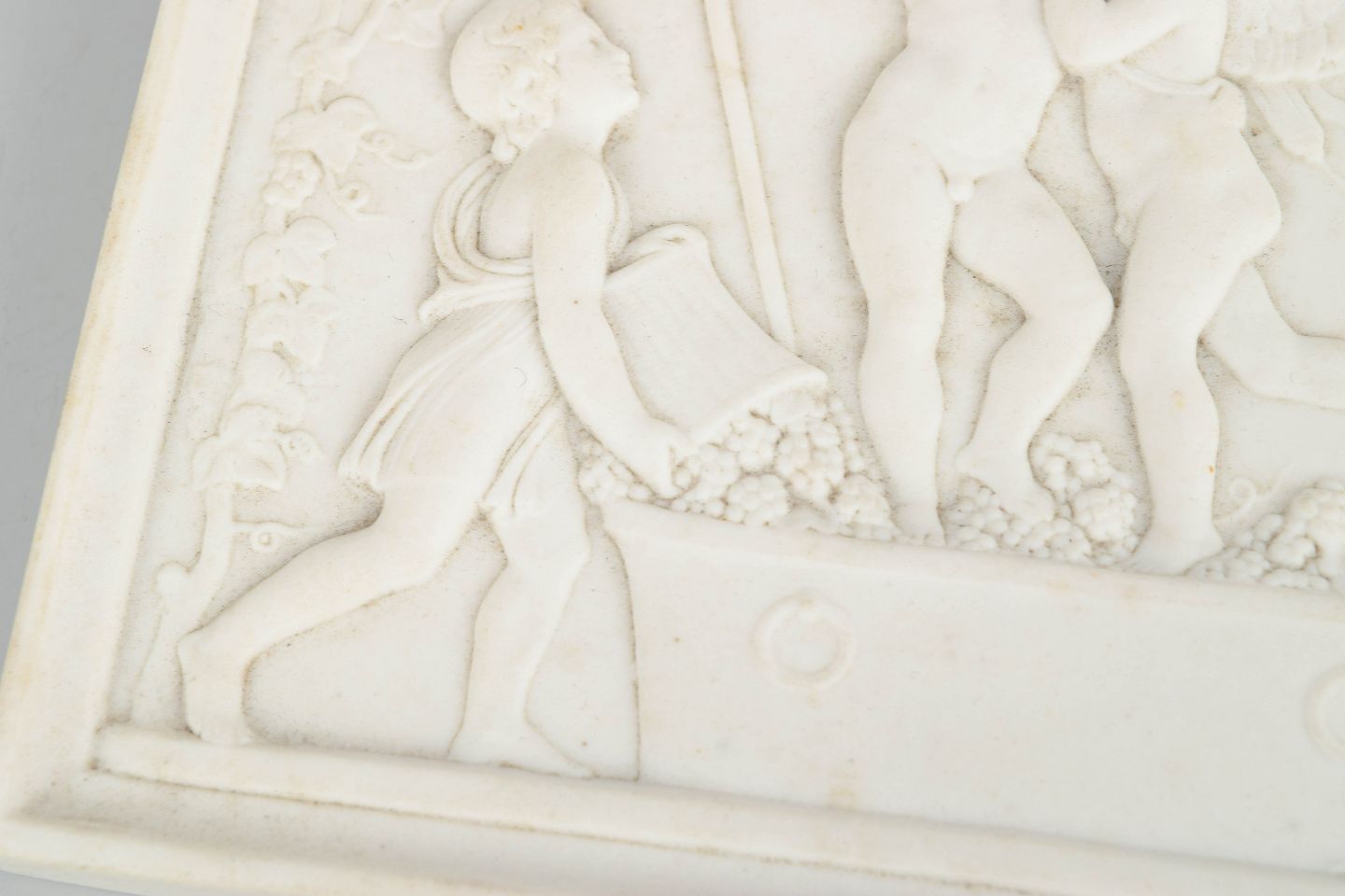Rectangular wall relief in white biscuit porcelain depicting a classical composition with putti after Bertel Thorvaldsen, executed with refined detailing and soft modelling in the neoclassical style.
