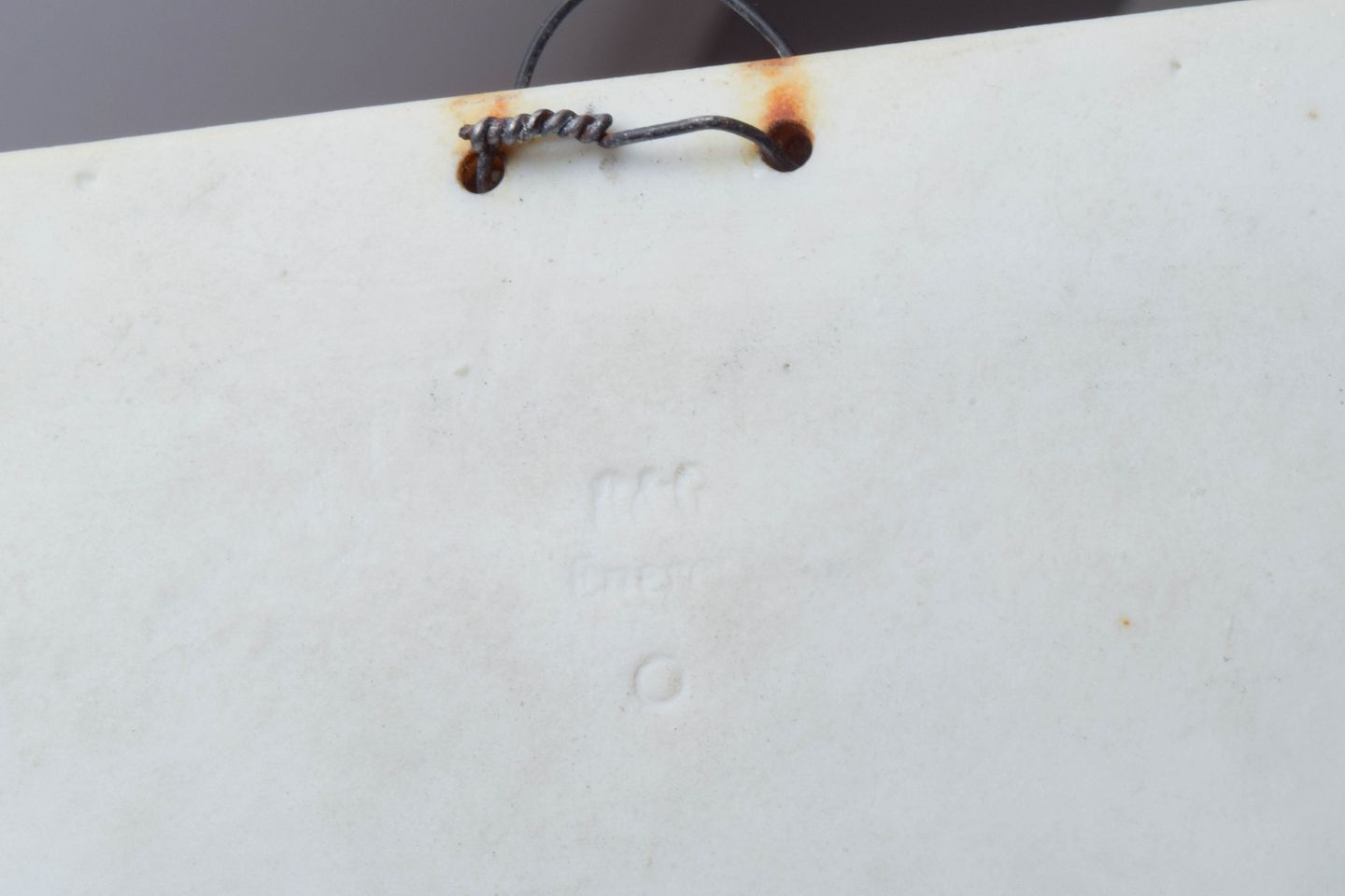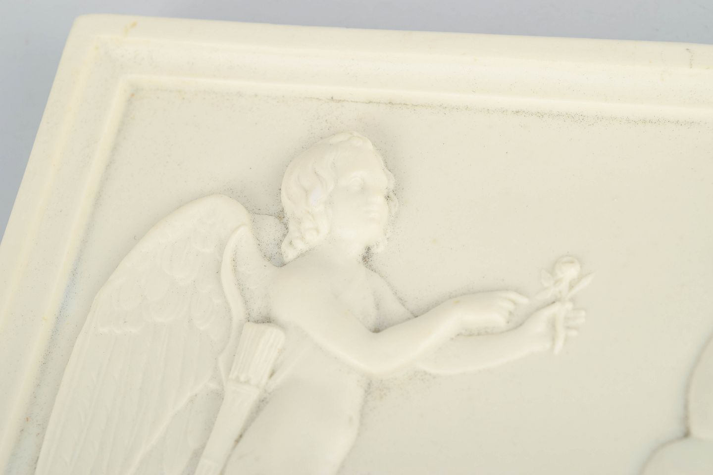 Rectangular wall relief in white biscuit porcelain featuring a classical figural motif after Bertel Thorvaldsen, executed with refined detailing and soft modelling in the neoclassical style.
