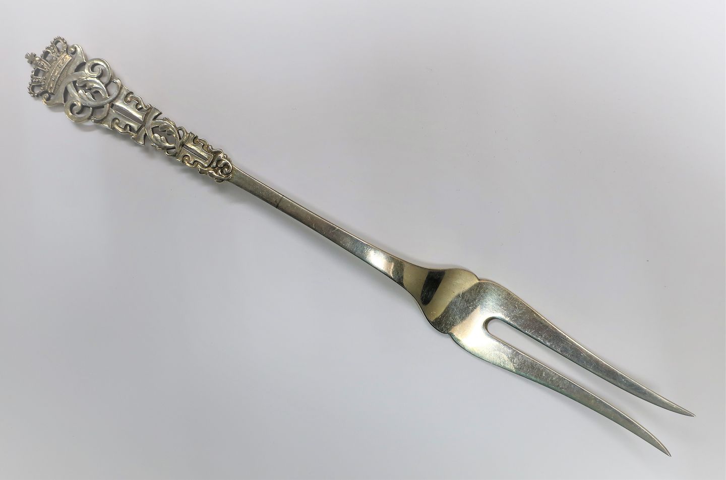 Michelsen. Fir kongeske mønster. Stegegaffel. Længde 25,5 cm. Produceret 1900.