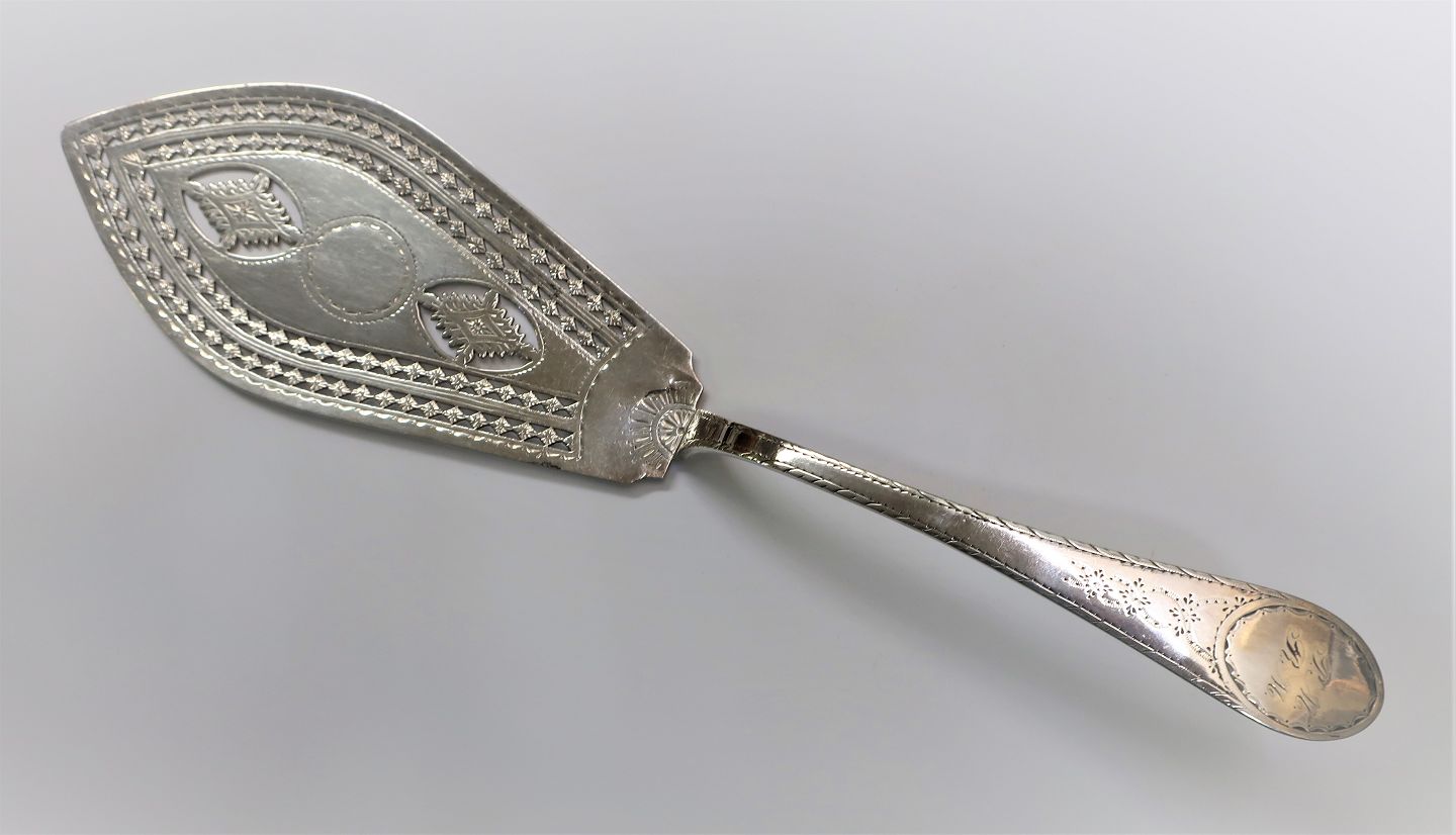 Andreas Holm, København. Empire Fiskespade sølv (830). Stemplet AH89. Længde 32 cm. Produceret 1789.