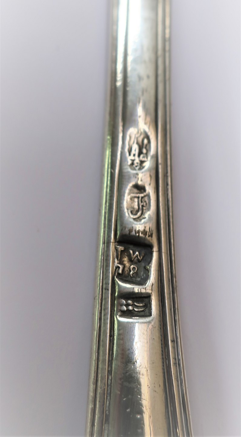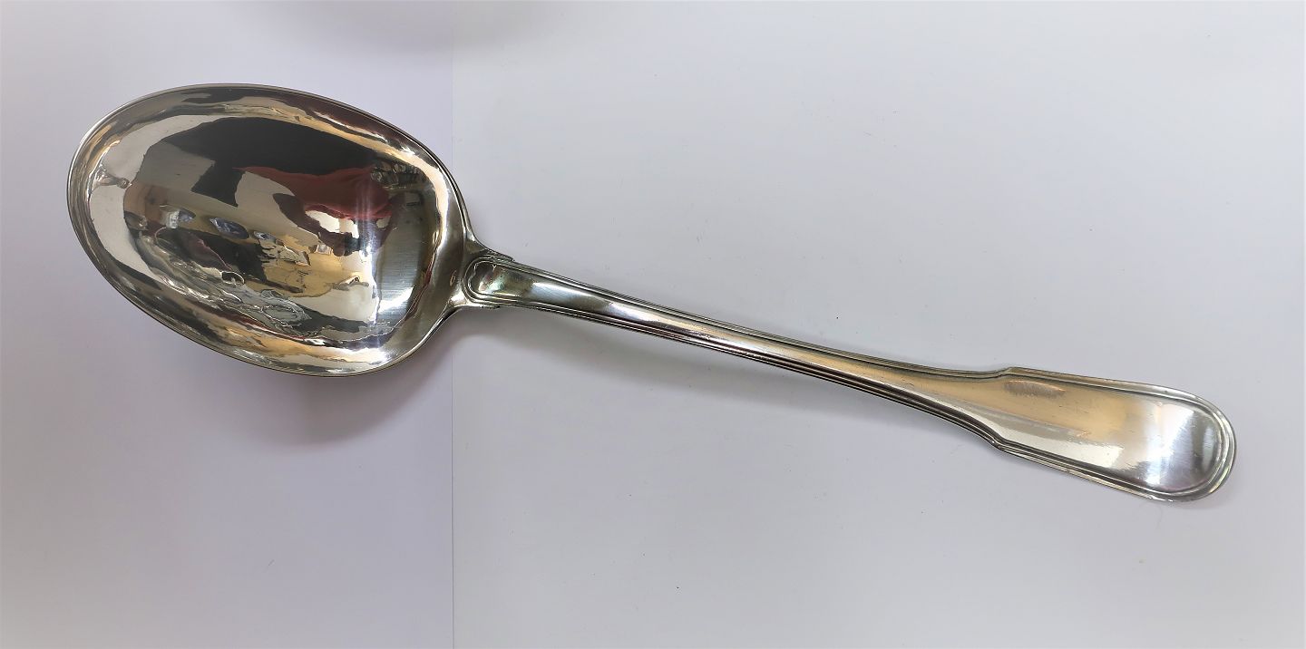 Thomas Andreas Westrup. Sølvbestik (830). Antik Potageske. Længde 36,5 cm. Produceret 1778.