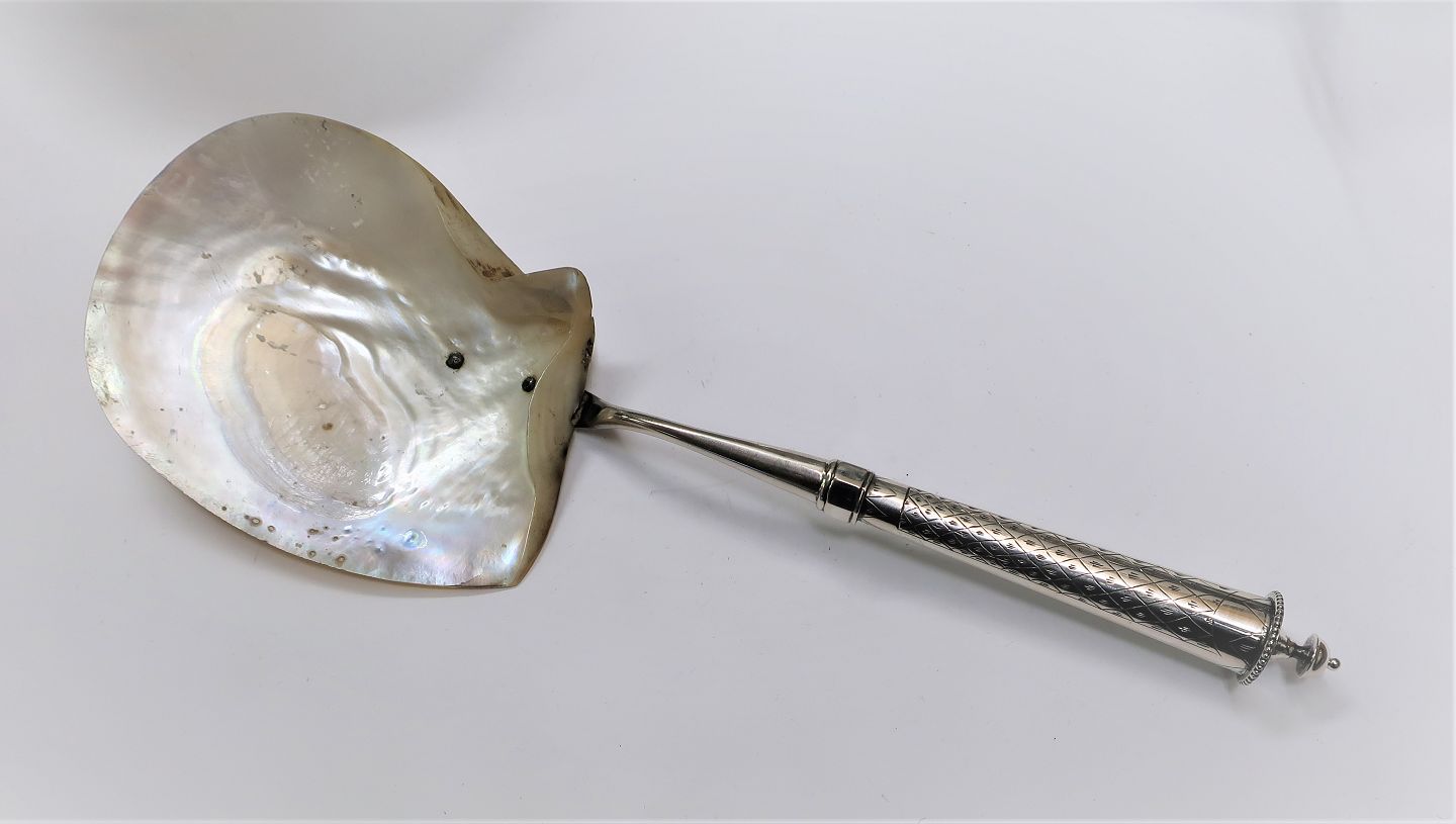 Silber Servierspaten mit Muschelschale. Gestempelt JER. Länge 28,5 cm.