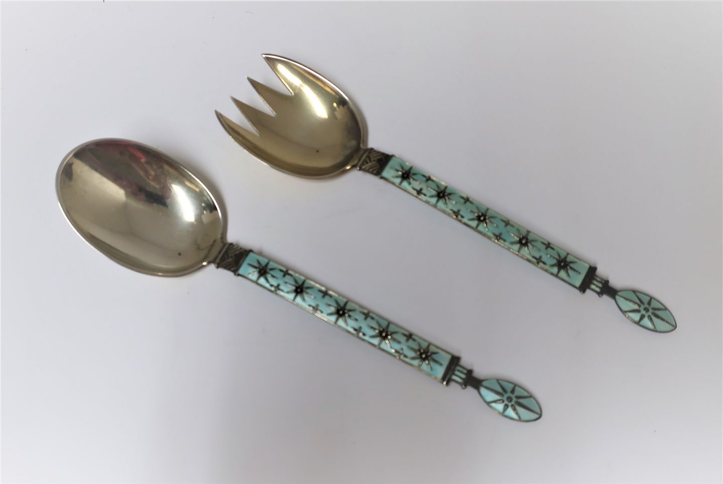 Norge. Tostrup. Sterling (925). Serveringssæt med grøn emalje. Længde 17,5 cm.