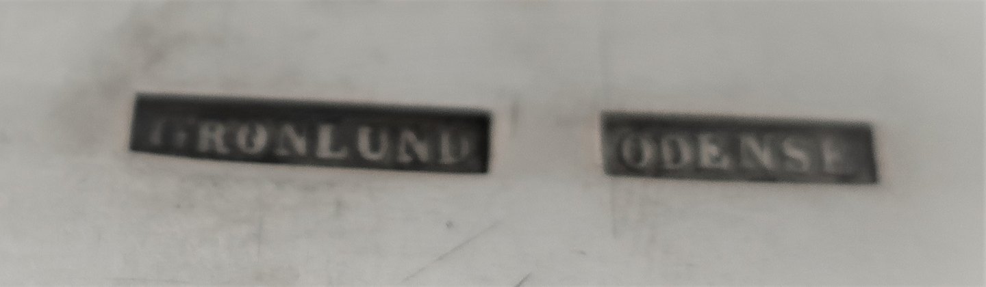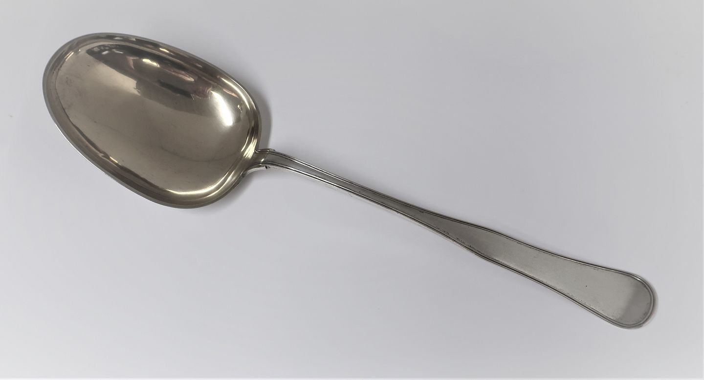 Grønlund, Odense. Potageske sølv. Længde 37 cm. Med indgravering : A.