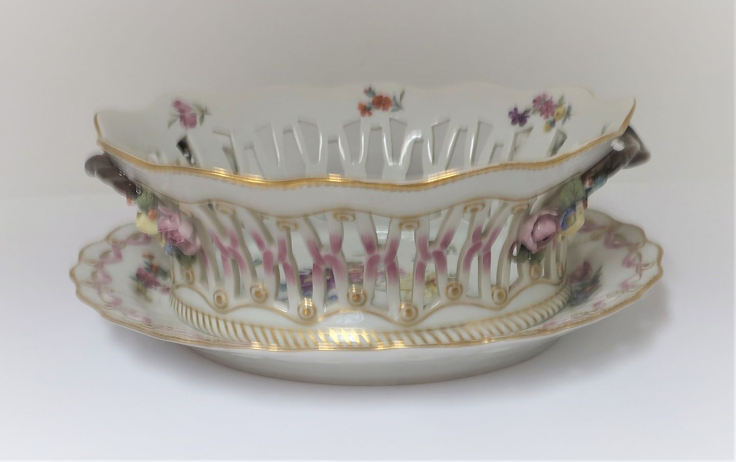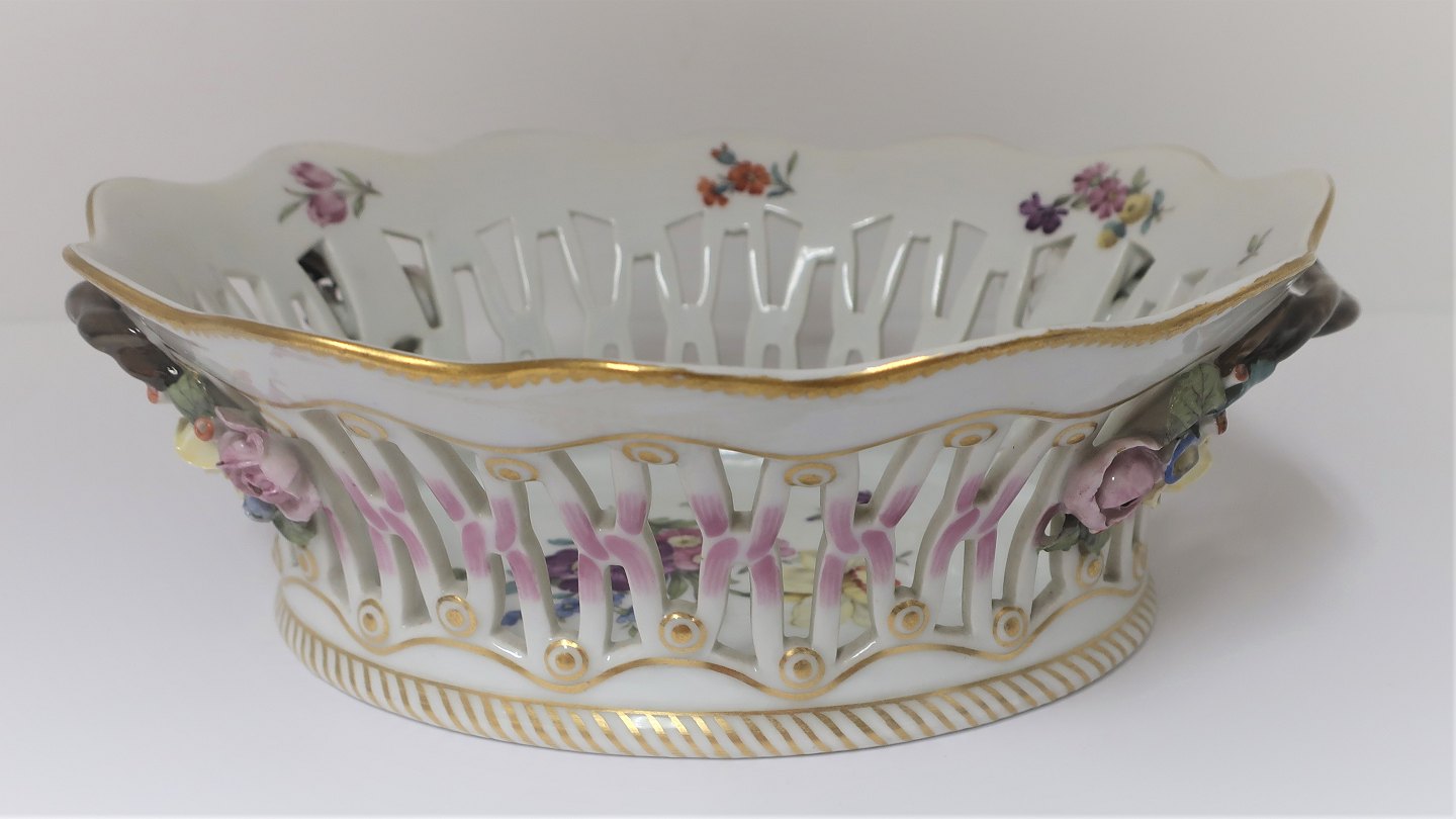 Royal Copenhagen. Saksisk blomst. Frugtskål med underfad. Model 1579 & 1580. Længde på skålen 26 cm. Produceret før 1890. (1 sortering)