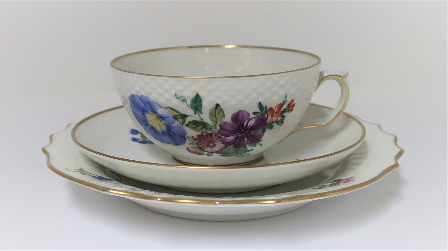 Royal Copenhagen. Let Saksisk blomst. Tekop med kagetallerken. Tekop model 493/1551. Kagetallerken 493/1625. Der er 8 sæt på lager. Prisen er per sæt