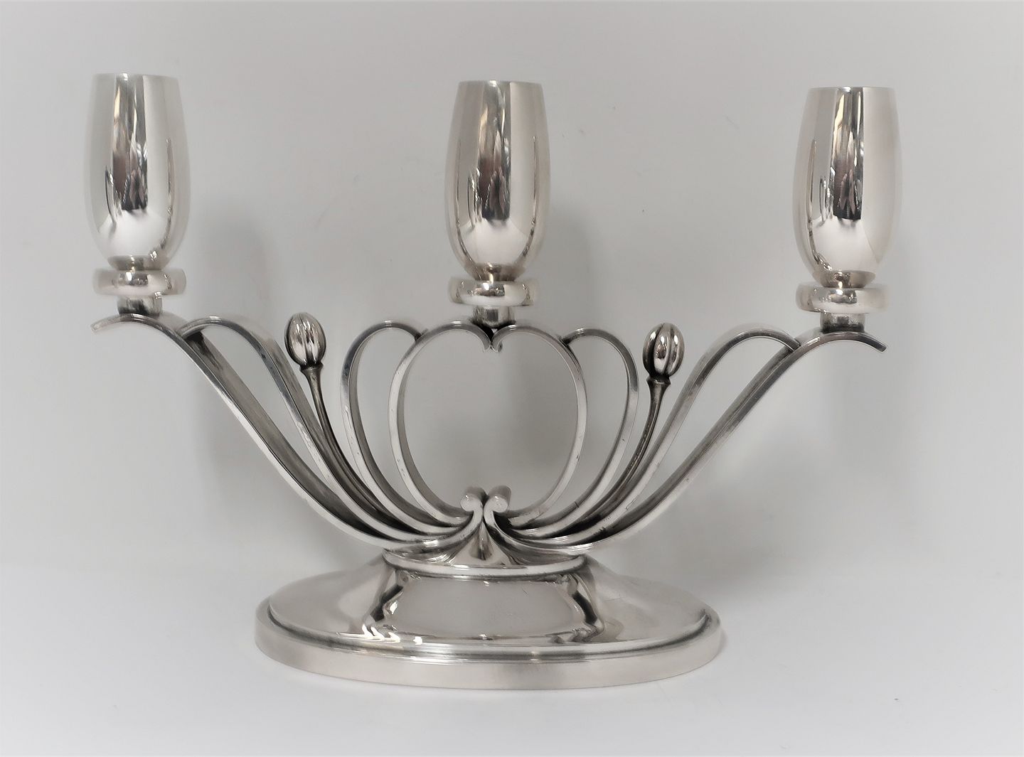 Evald Nielsen. 3-armet sølv lysestage. Højde 17,5 cm. Længde 25 cm. Produceret 1949.
