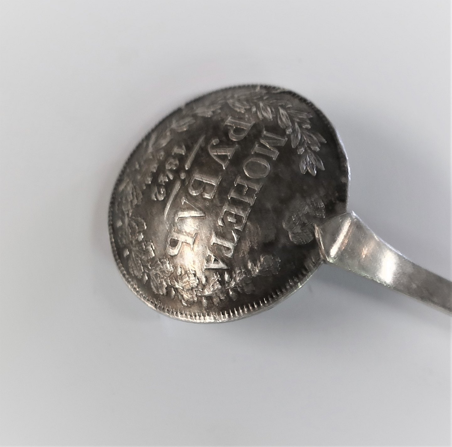 Silver spoon with Russian silver ruble from 1842. Length 13.6 cm