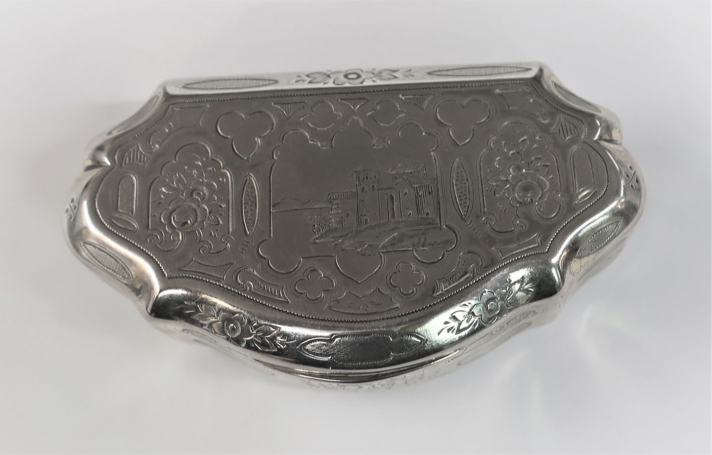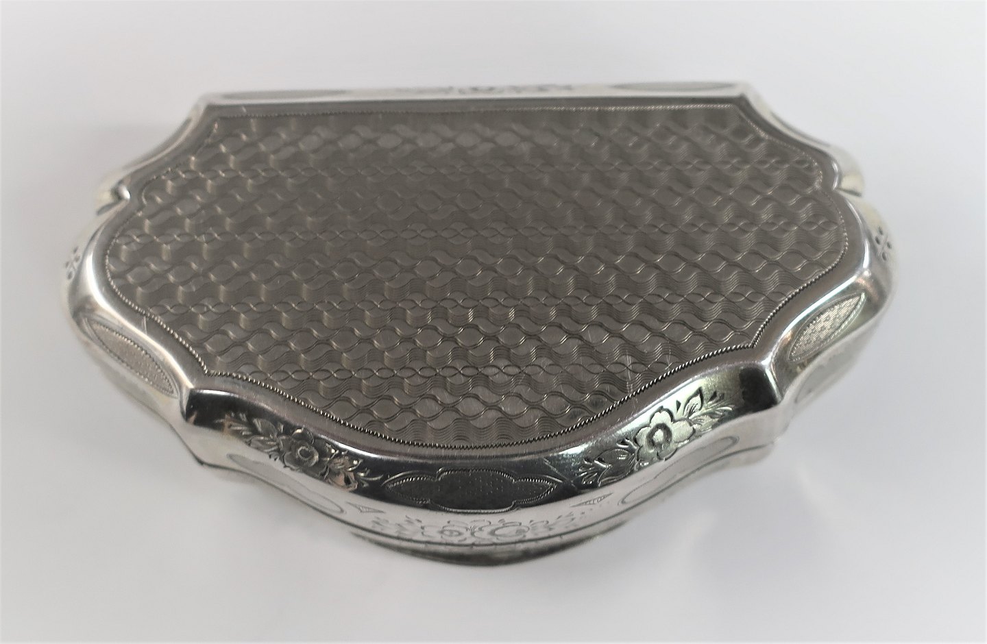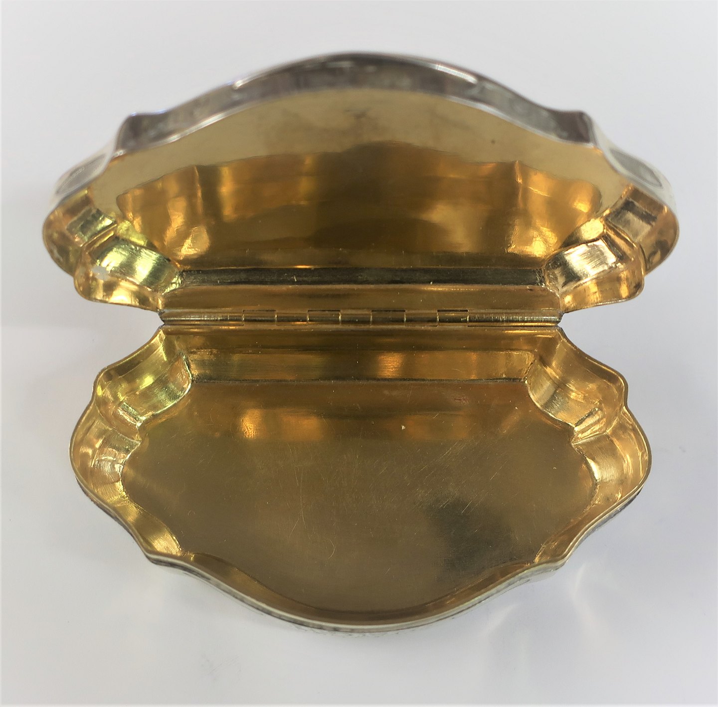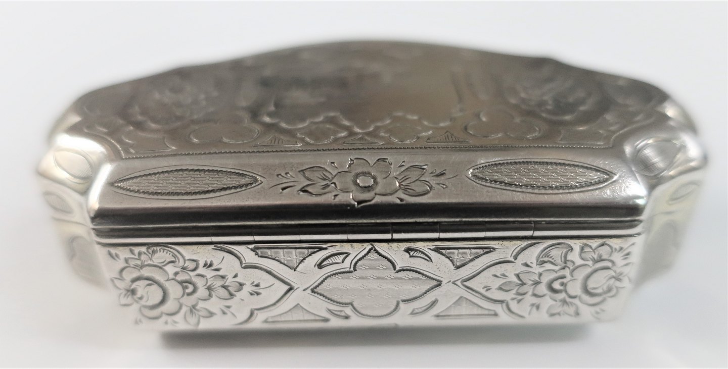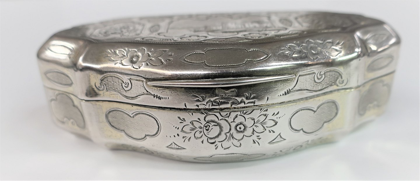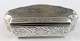 Sølvæske med indvendig forgyldning. Længde 9 cm. Bredde 5 cm. Med svensk importstempel. Produceret omkring 1870.