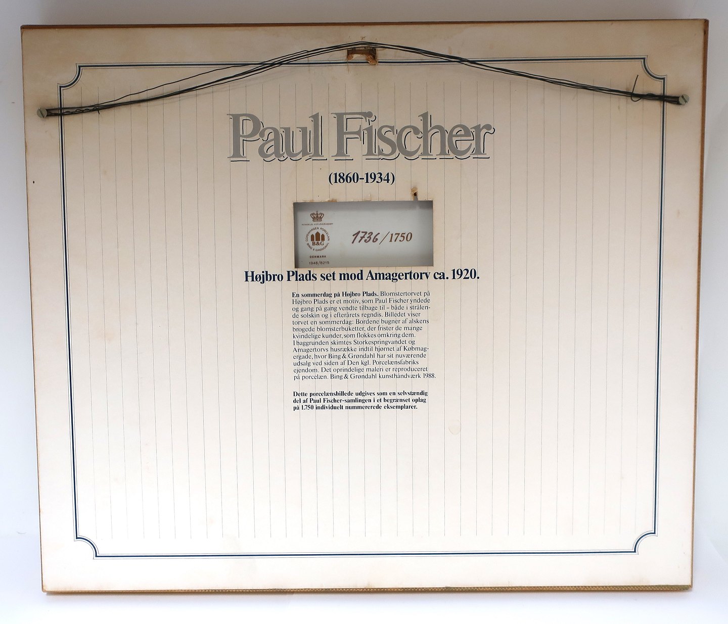 Bing & Grondahl. Porcelain painting. Motif by Paul Fischer. Höjbro Plads seen towards Amagertorv. Size inclusive frame, 41,5 * 35 cm. Produced 1750 pieces. This has number 1736