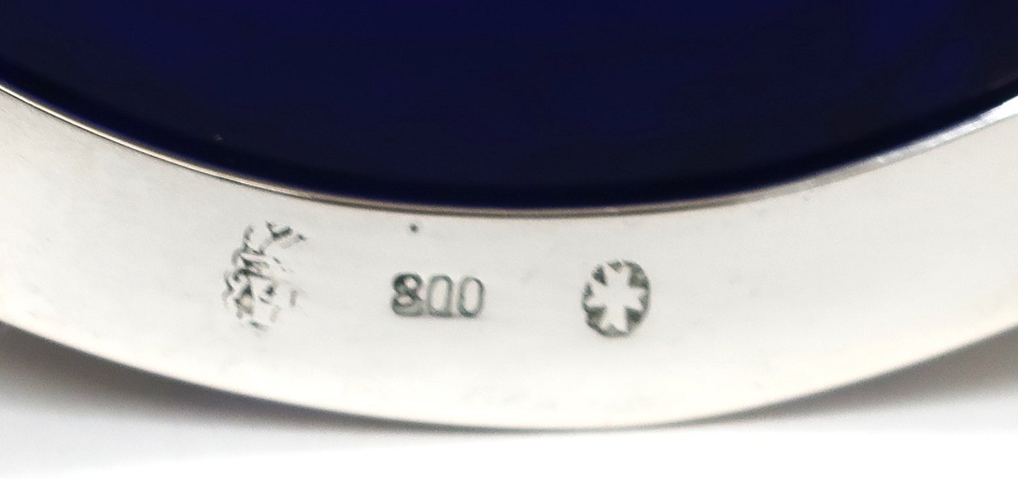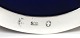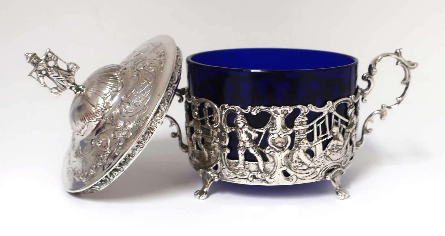Sukkerskål med blåt glas og sølvmontering (800). Diameter 9 cm.
