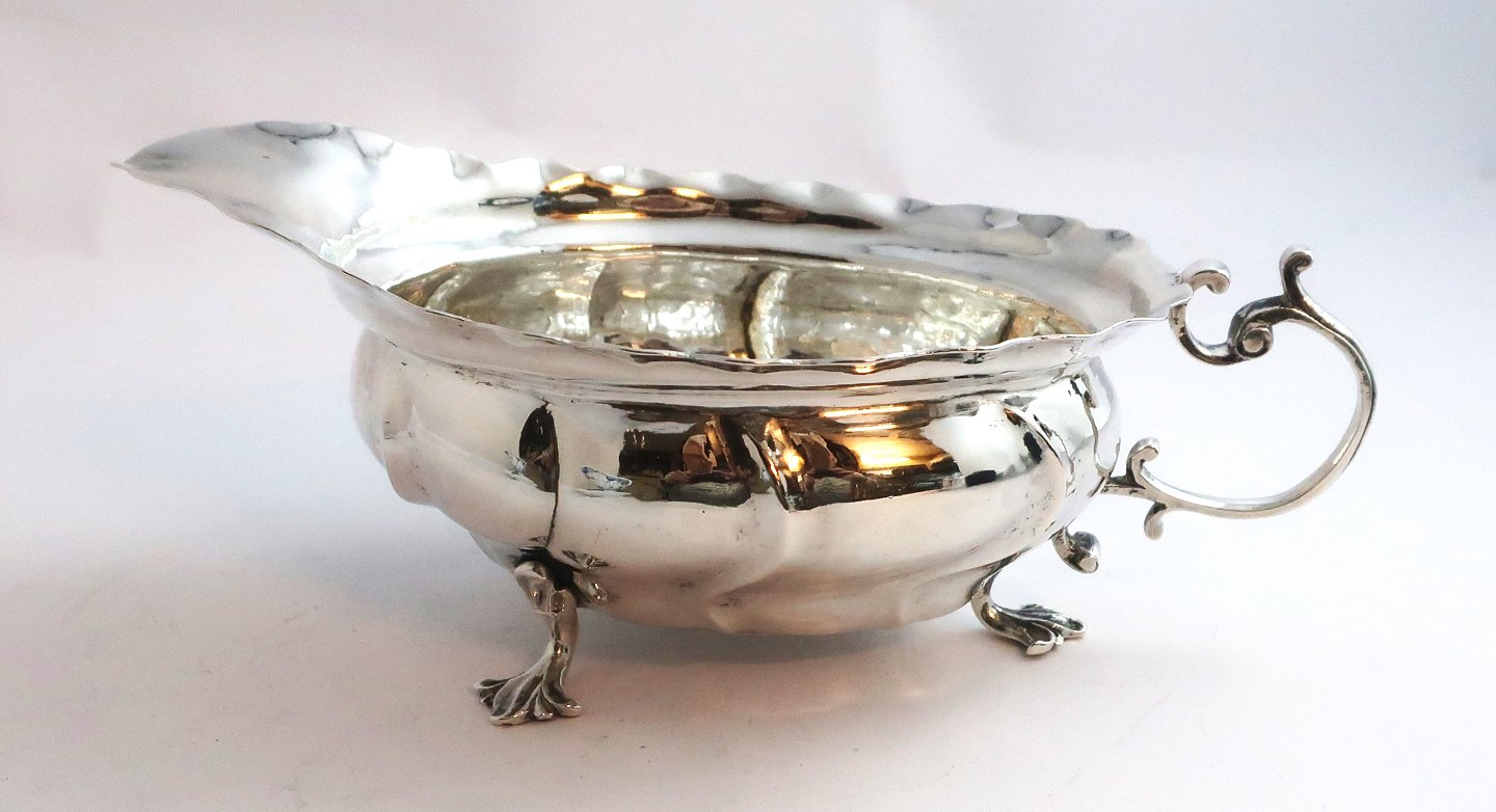 Thomas Andreas Westrup, København. Rokoko saucekande af sølv (830). Skævkækket. Længde 19 cm. Produceret 1770.