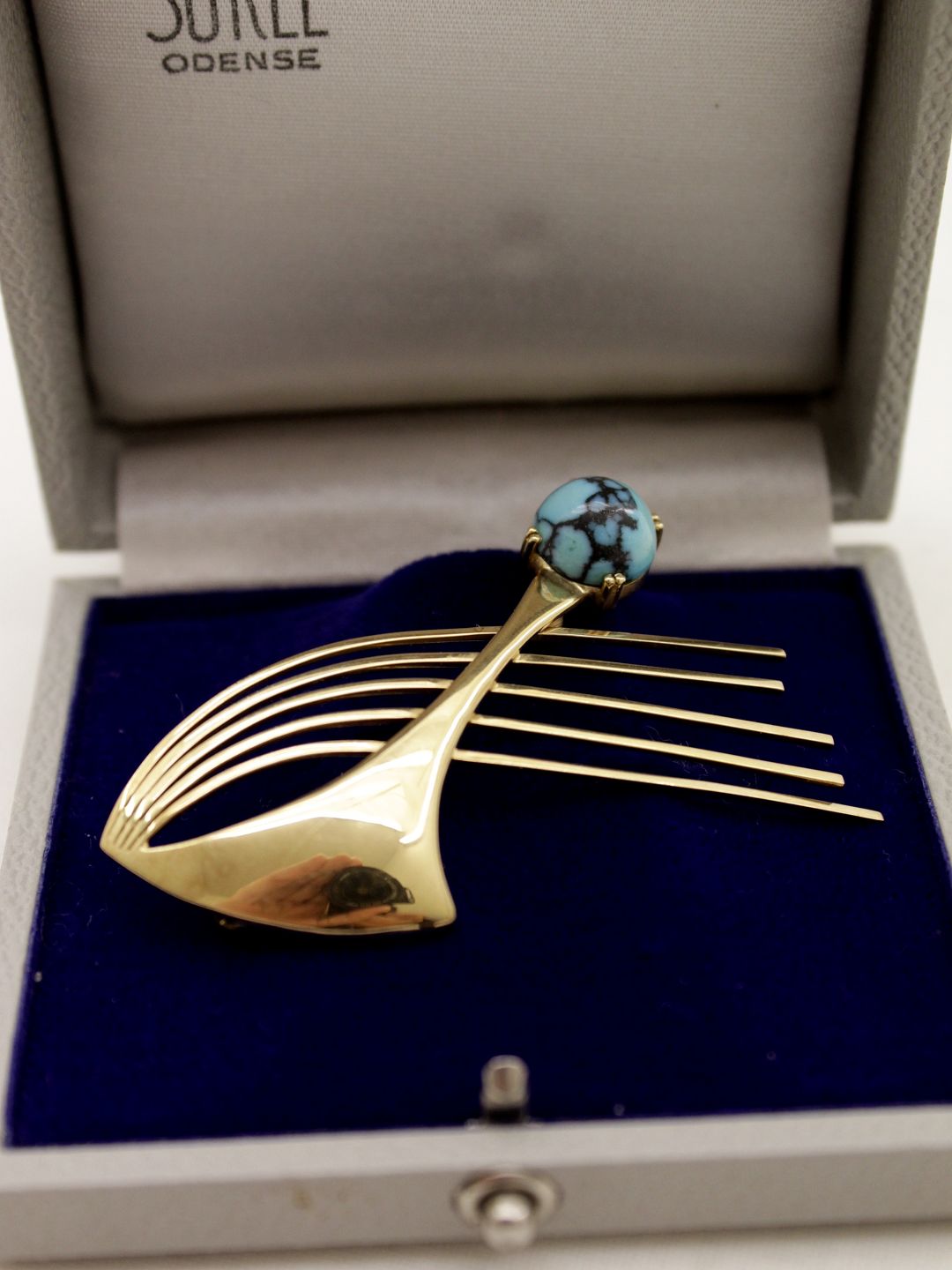 14 karat guld broche 6 x 4 cm. med turkis stemplet KVA 585 for guldsmed K V Andersen Nr. 290499