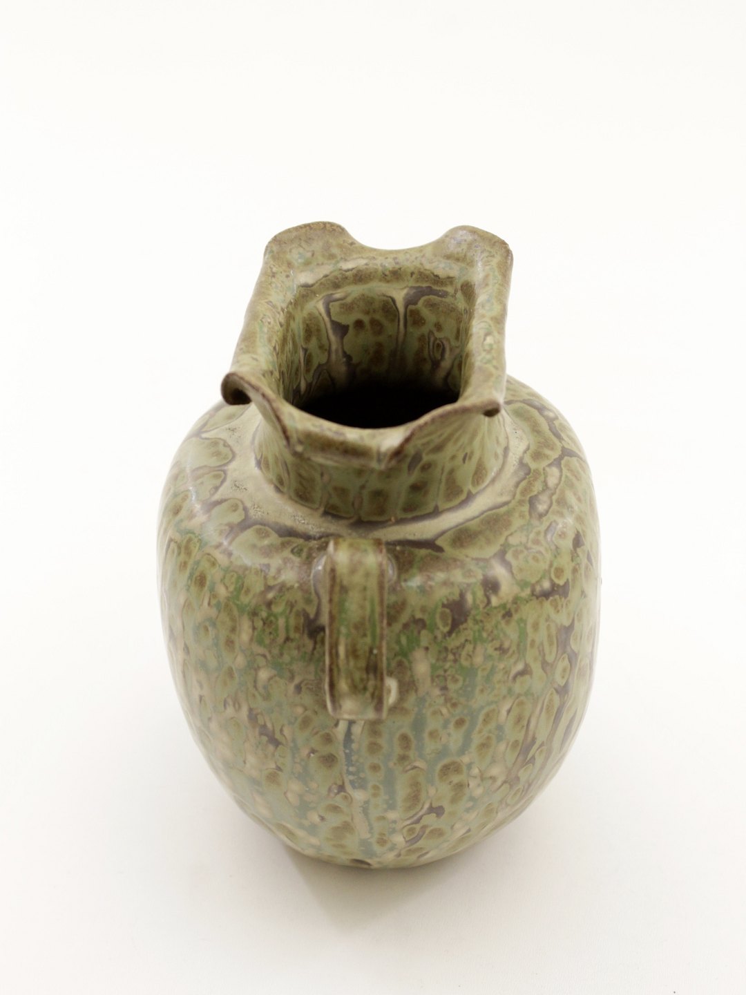 Arne Bang (1901-1983) stoneware vase with beautiful glass H. 14 cm. and with folded edge signed monogram no. 328010