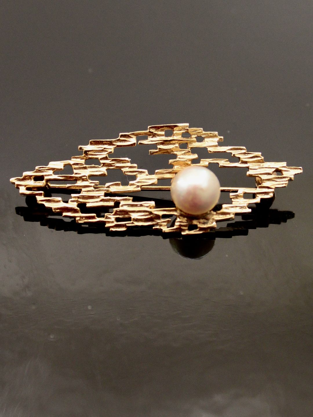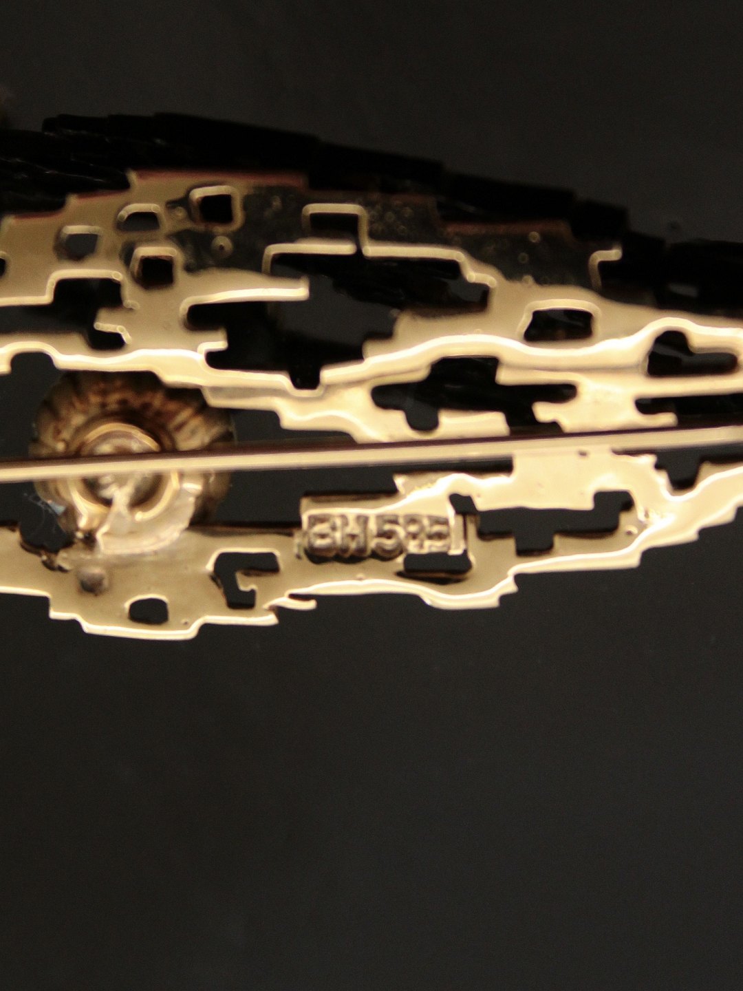 14 karat guld broche 4,3 x 1,6 cm. med perle fra juveler B.Hertz København emne nr. 493631