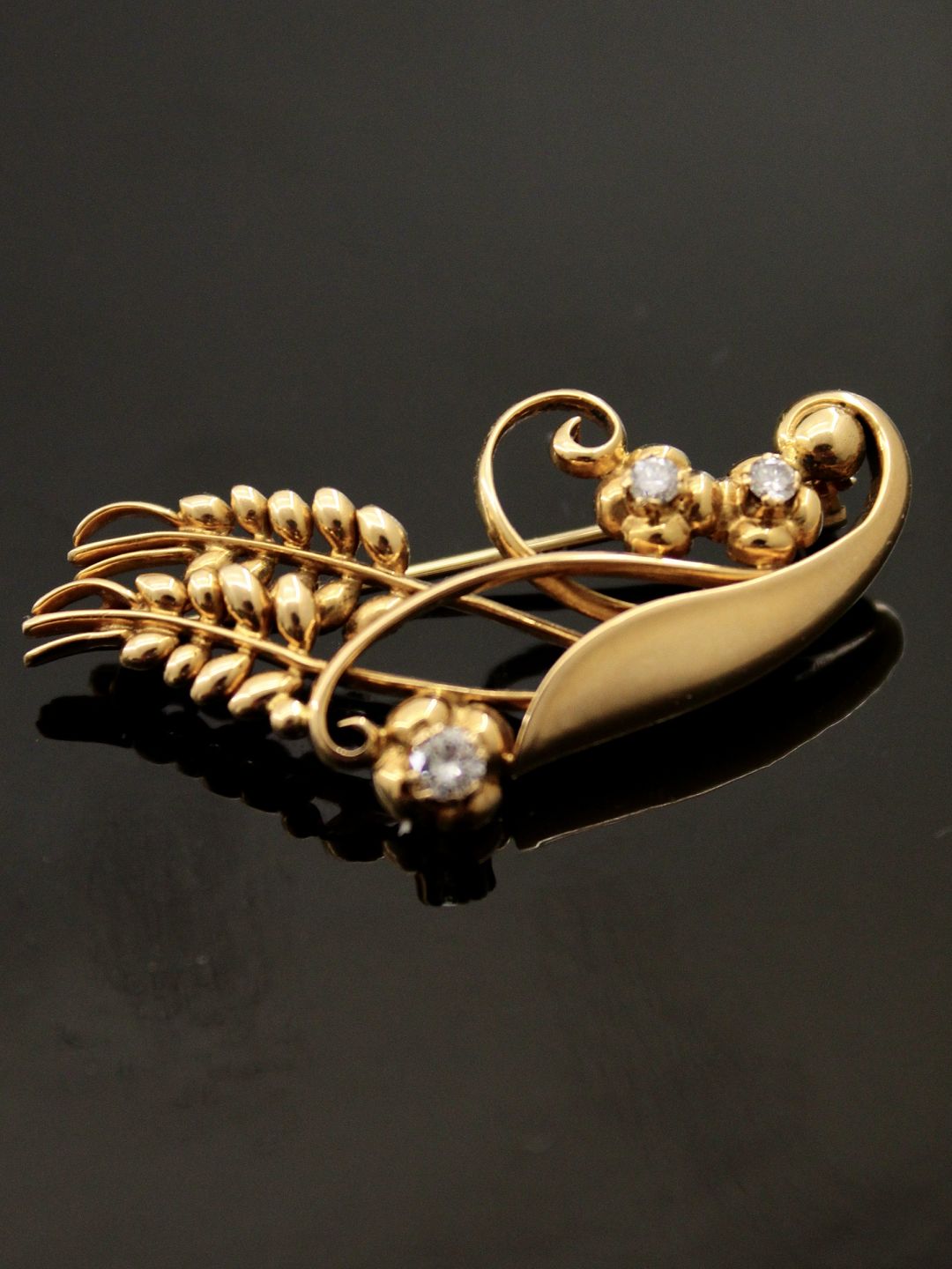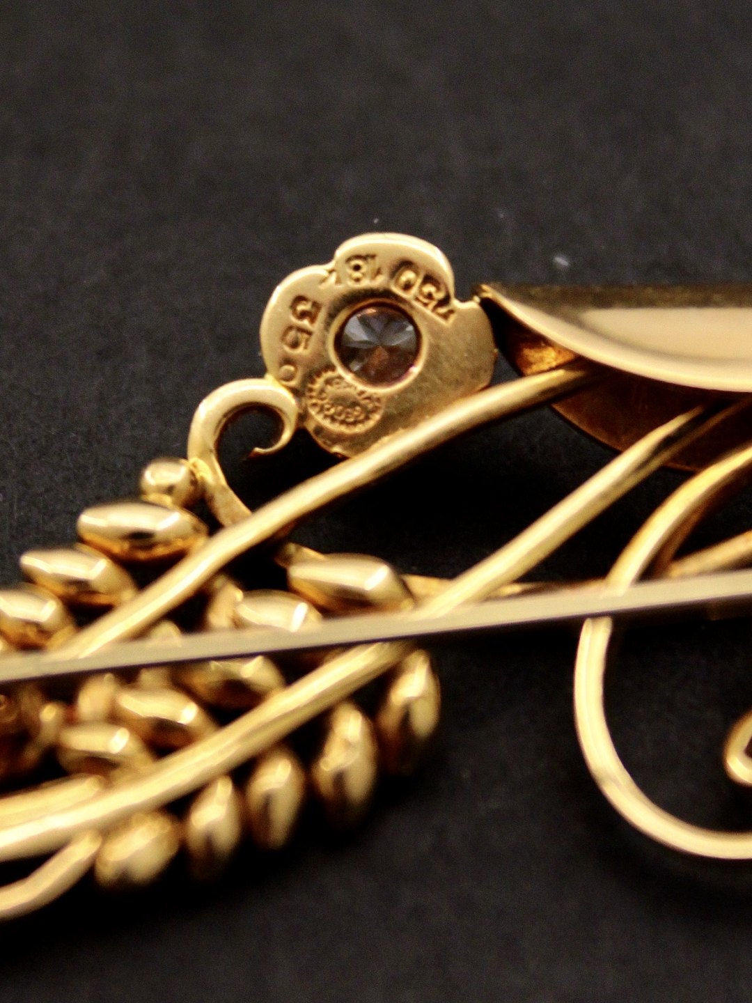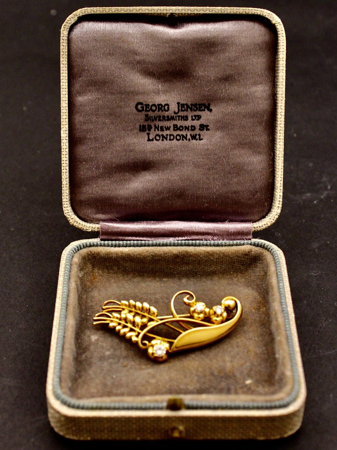 GEORG JENSEN vintage 18 karat guld broche design #35 med 3 brilliant slebne diamanter 4,3 x 2 cm. vægt 9 gram stempel efter 1940 flot stand emne nr. 495534