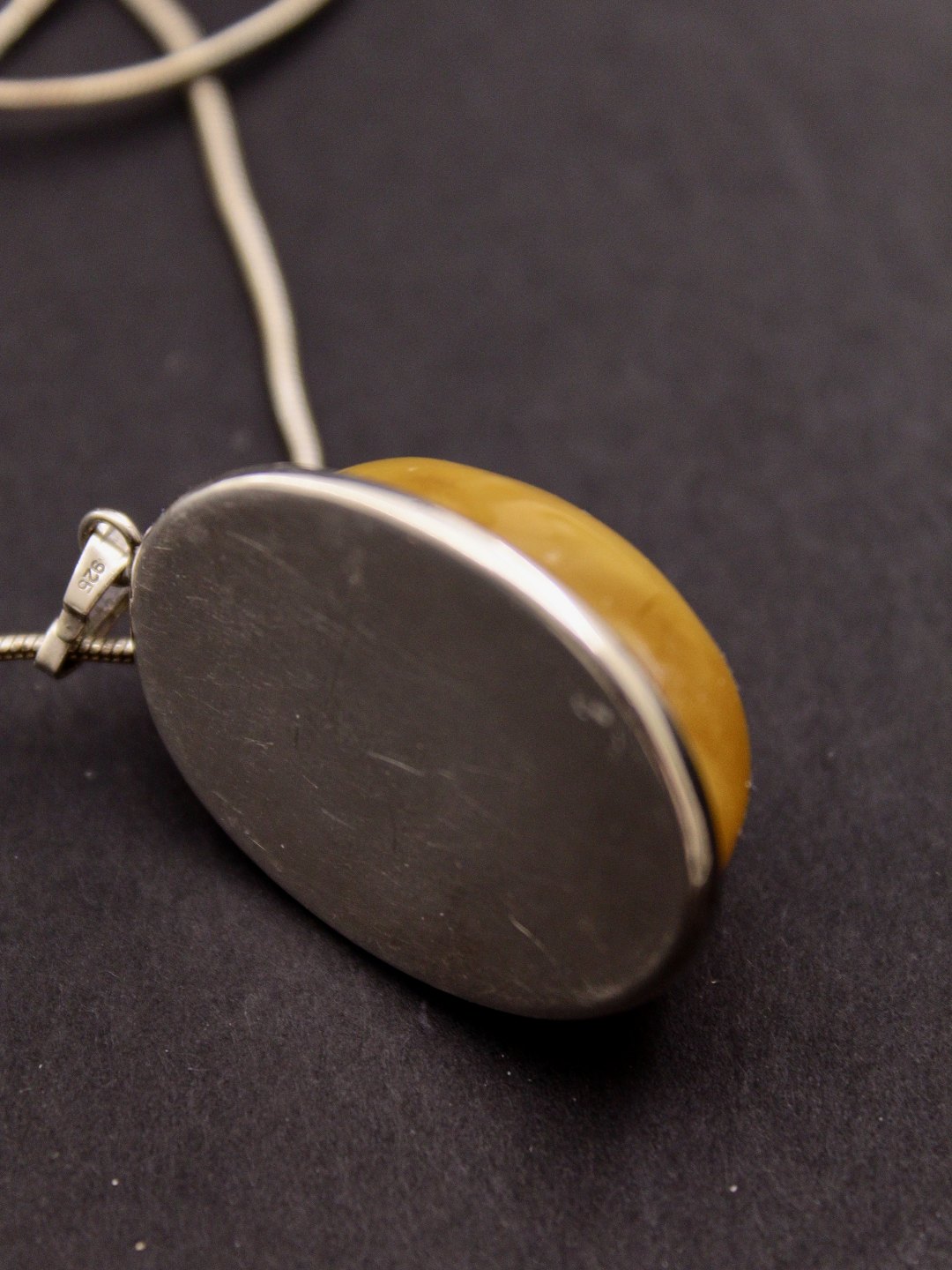 Rav vedhæng 2,5 x 3,4 cm. med sterling sølv montering og kæde 42 cm. emne nr. 519072